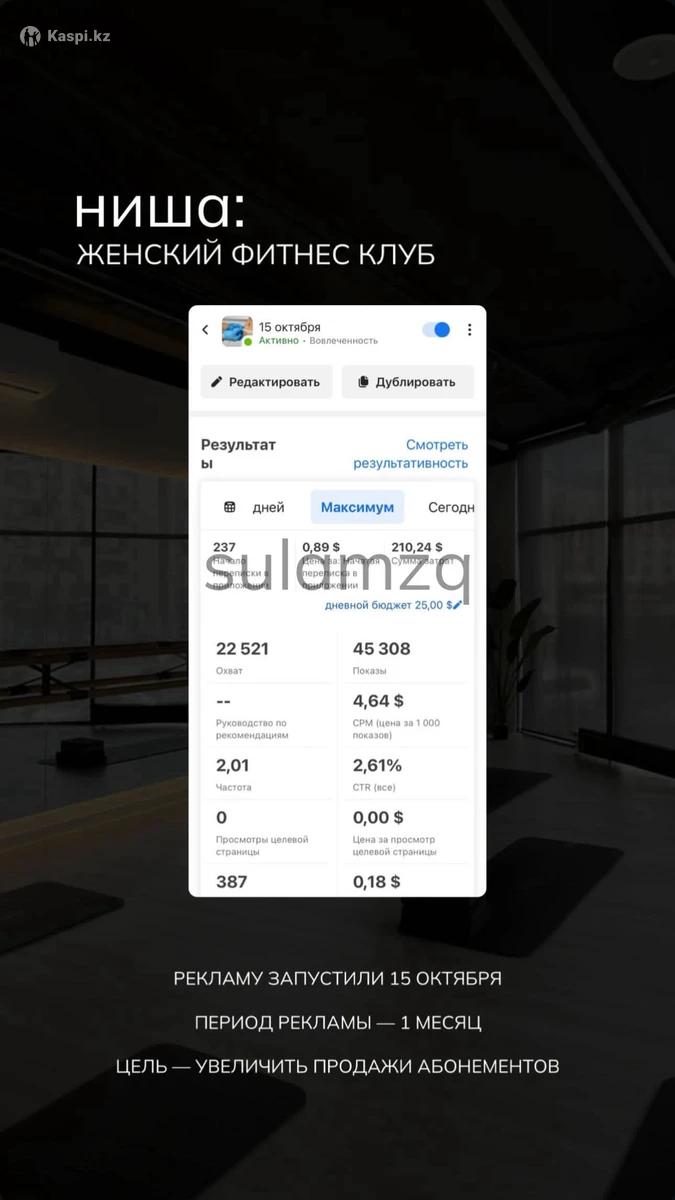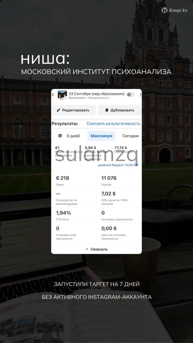 Меня зовут Султан! Я действующий таргетолог с двухлетним опытом Почему именно я? •Я работаю на 100% результат •Для меня важно качество и честность •Всегда на связи •Если реклама не работает — верну деньги •Работаю по официальному договору В мои услуги входит следующее: Даю рекомендации по странице. Составляю стратегию рекламы. Анализ целевой аудитории. Анализ конкурентов. Пишу текст для рекламы. Разрабатываю аферы и креативы Запуск рекламы Ежедневный контроль рекламы Ежедневный аналитический отчет по рекламе Полная прозрачность работы - вы всегда видите, что и как делается Работаю по официальному договору. Даю гарантию на качество и результат рекламы