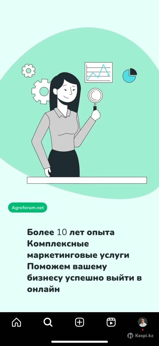 Мы Казахстанский проект - площадка и агенство полного маркетингового цикла. Место где встречаются представители агробизнеса со всего мира. Мы поможем Вашему бизнесу упаковать ваше предложение, запустить сайт и продвижение во всех рекламных каналах и успешно выйти в онлайн, начать получать клиентов и продажи из Интернета с помощью нашей платформы и команды профессионалов! Ваш проект будет вести Ваш персональный менеджер! Что мы предлагаем : - Упаковка бизнеса; - Создание сайта на нашей платформе; - Продвижение сайта в Google и Яндекс; - Онлайн визитка с функциями TapLink, Портфолио и QR; - Продвижение в поисковых системах - SEO; - Настройка и ведение рекламных кампаний Google и Яндекс, - Таргетированная реклама Meta (instagram, Facebook), VK, Mytarget Наша команда это большой штат сотрудников мы ваш таргетолог, маркетолог, директолог, программист в одном лице, в лице нашей технологичной платформы, которая автоматизирует множество процессов и сэкономит вам приличную сумму денег, плюс работа выделенного менеджера под ваш проект, который выведет ваш бизнес на продажи через Интернет! Кроме того, начать работу с нами можно и с Бесплатного тарифа, просто позвоните нам!