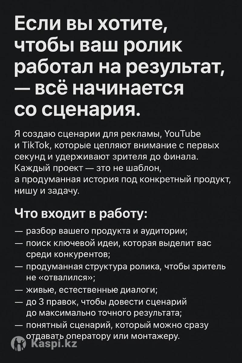 Если вы хотите, чтобы ваш ролик работал на результат, — всё начинается со сценария. Я создаю сценарии для рекламы, YouTube и TikTok, которые цепляют внимание с первых секунд и удерживают зрителя до финала. Каждый проект — это не шаблон, а продуманная история под конкретный продукт, нишу и задачу. Что входит в работу: — разбор вашего продукта и аудитории; — поиск ключевой идеи, которая выделит вас среди конкурентов; — продуманная структура ролика, чтобы зритель не “отвалился”; — живые, естественные диалоги; — до 3 правок, чтобы довести сценарий до максимально точного результата; — понятный сценарий, который можно сразу отдавать оператору или монтажёру. Для чего подходят мои сценарии: • рекламные ролики, которые должны продавать; • короткие видео для TikTok и Reels, которым важно цеплять быстро; • YouTube-ролики, где нужна история; • мини-фильмы, в которых важен смысл и динамика. Почему со мной удобно работать: — каждый сценарий пишется “под камеру”, чтобы съёмка проходила без хаоса; — структура выстроена так, чтобы зритель досмотрел до конца; — сюжет не просто красивый — он мотивирует к действию; — я беру идею и превращаю её в историю, которую хочется смотреть. Если вам нужен сценарий, который решает задачу бизнеса и выделяет проект — я готов взяться за работу.