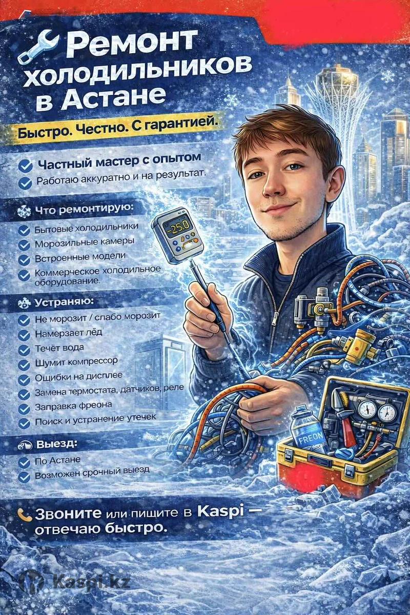 🔧 Ремонт холодильников в Астане Быстро. Честно. С гарантией. 👨🔧 Частный мастер с опытом Работаю аккуратно и на результат. 🧊 Что ремонтирую: • Бытовые холодильники • Морозильные камеры • Встроенные модели • Коммерческое холодильное оборудование ⚙️ Устраняю: • Не морозит / слабо морозит • Намерзает лед • Течет вода • Шумит компрессор • Ошибки на дисплее • Замена термостата, датчиков, реле • Заправка фреона • Поиск и устранение утечек 🚗 Выезд: • По Астане • Возможен срочный выезд ✅ Поченьу выбирают меня: • Честная диагностика • Объясняю причину поломки • Без навязанных услуги • Гарантия на работу • Работаю с современными контроллерами и автоматикой 📞 Звоните или пишите в Kaspi — отвечаю быстро.