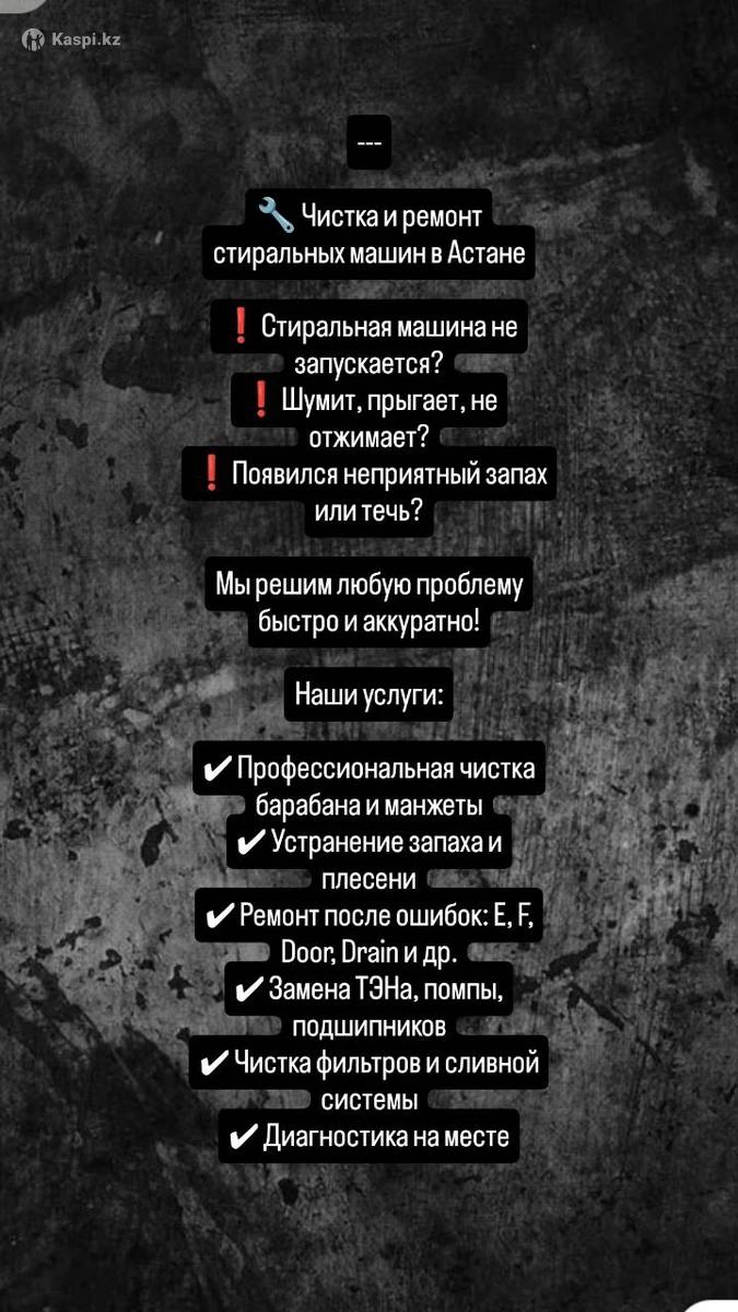 Ремонт и профессиональная чистка стиральных машин любых марок. Работаем по всему городу Астана! 🚗 🔹 Не отжимает 🔹 Не сливает воду 🔹 Пахнет после стирки 🔹 Шумит или не крутит барабан 🔹 Не включается ✅ Выезд мастера на дом ✅ Гарантия на все работы ✅ Быстро и аккуратно ✅ Доступные цены 📲 Пишите или звоните — приедем сегодня!
