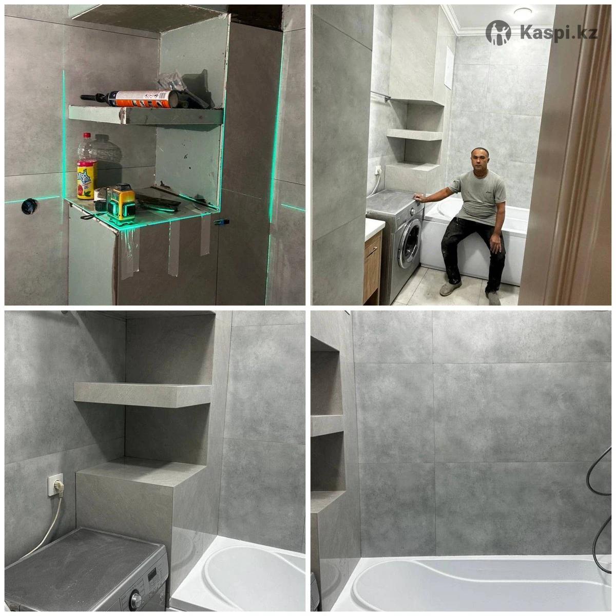 Кладка кафеля, керамогранита Демонтаж старого кафеля Гидроизоляция Гипсокартон Штукатурка под маяк Наливной пол Стяжка Установка сантехники Запил по 45 Залив душевого поддона