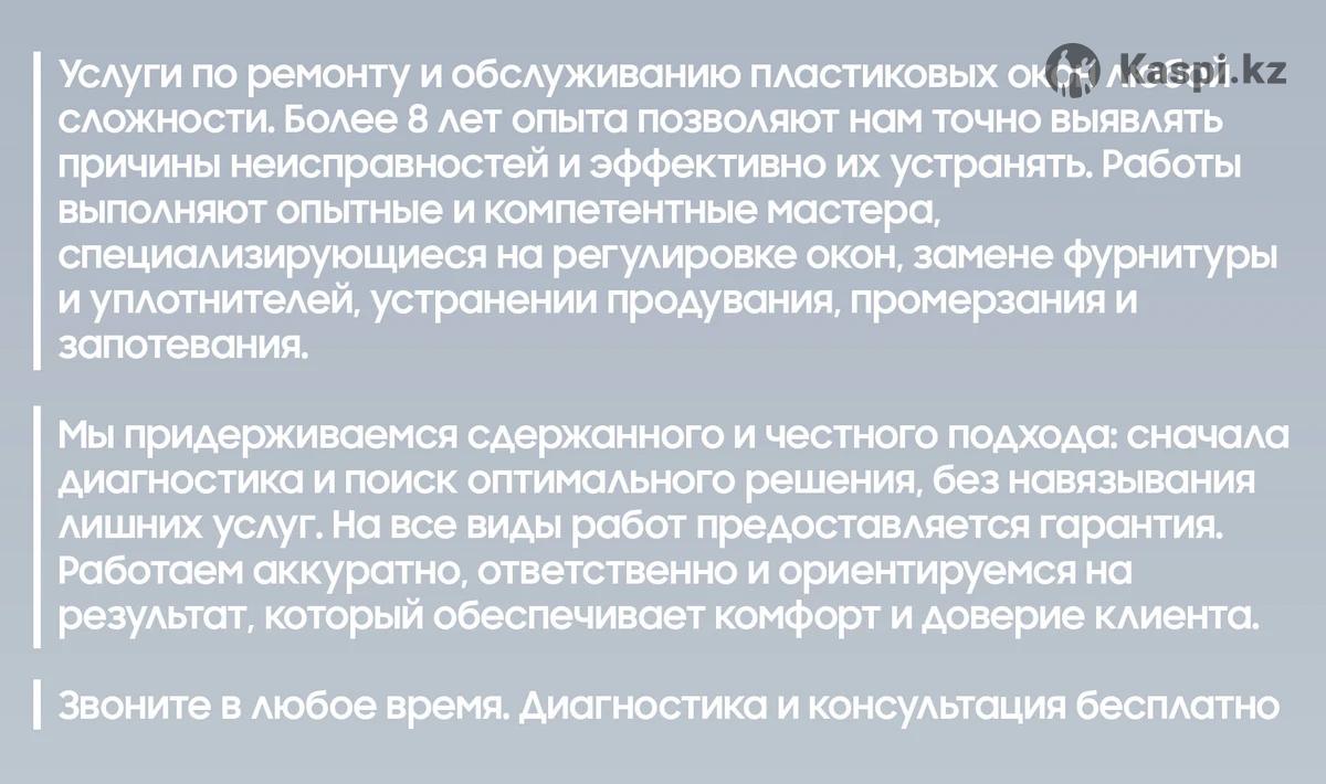Услуги по ремонту и обслуживанию пластиковых окон любой сложности. Более 8 лет опыта позволяют нам точно выявлять причины неисправностей и эффективно их устранять. Работы выполняют опытные и компетентные мастера, специализирующиеся на регулировке окон, замене фурнитуры и уплотнителей, устранении продувания, промерзания и запотевания. Мы придерживаемся сдержанного и честного подхода: сначала диагностика и поиск оптимального решения, без навязывания лишних услуг. На все виды работ предоставляется гарантия. Работаем аккуратно, ответственно и ориентируемся на результат, который обеспечивает комфорт и доверие клиента. Звоните в любое время. Диагностика и консультация бесплатно!