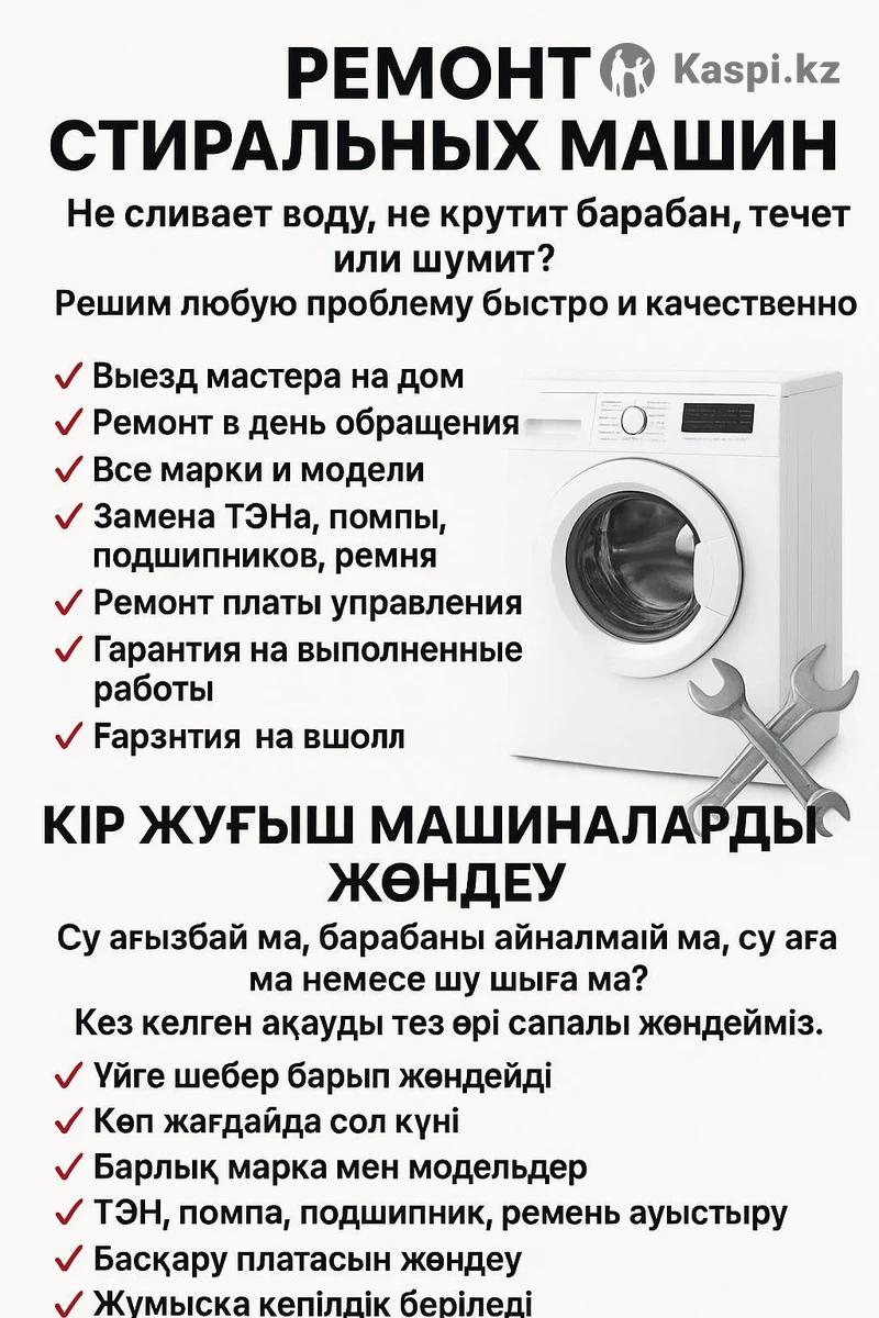🔧 РЕМОНТ СТИРАЛЬНЫХ МАШИН 🔧 Не сливает воду, не крутит барабан, течёт или шумит? Решим любую проблему быстро и качественно. ✔ Выезд мастера на дом ✔ Ремонт в день обращения ✔ Все марки и модели ✔ Замена ТЭНа, помпы, подшипников, ремня ✔ Ремонт платы управления ✔ Гарантия на выполненные работы 📞 Звоните — починим сегодня! 🔧 КІР ЖУҒЫШ МАШИНАЛАРДЫ ЖӨНДЕУ 🔧 Су ағызбай ма, барабаны айналмай ма, су аға ма немесе шу шыға ма? Кез келген ақауды тез әрі сапалы жөндейміз. ✔ Үйге шебер барып жөндейді ✔ Көп жағдайда сол күні ✔ Барлық марка мен модельдер ✔ ТЭН, помпа, подшипник, ремень ауыстыру ✔ Басқару платасын жөндеу ✔ Жұмысқа кепілдік беріледі 📞 Қоңырау шалыңыз — бүгін-ақ жөндеп береміз!