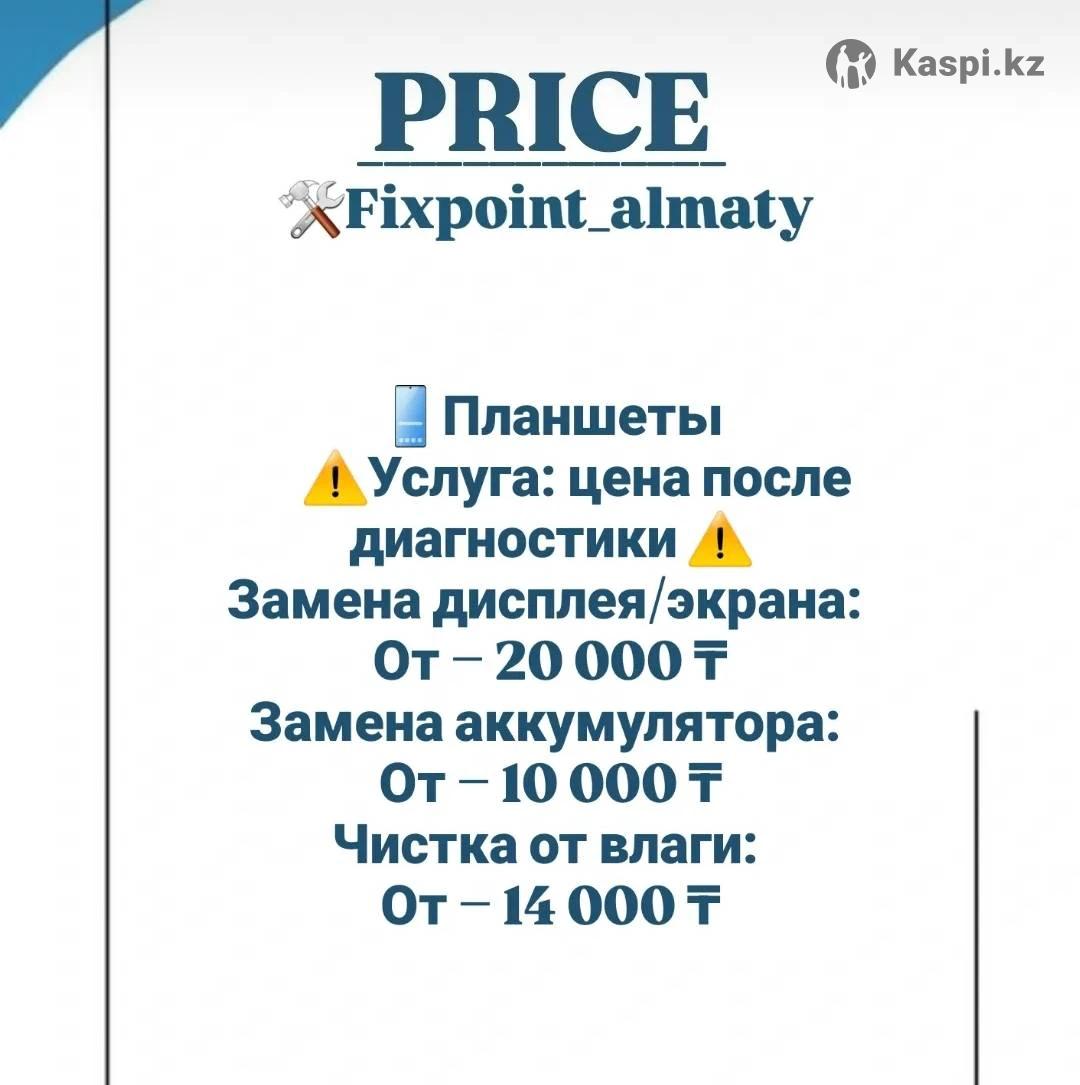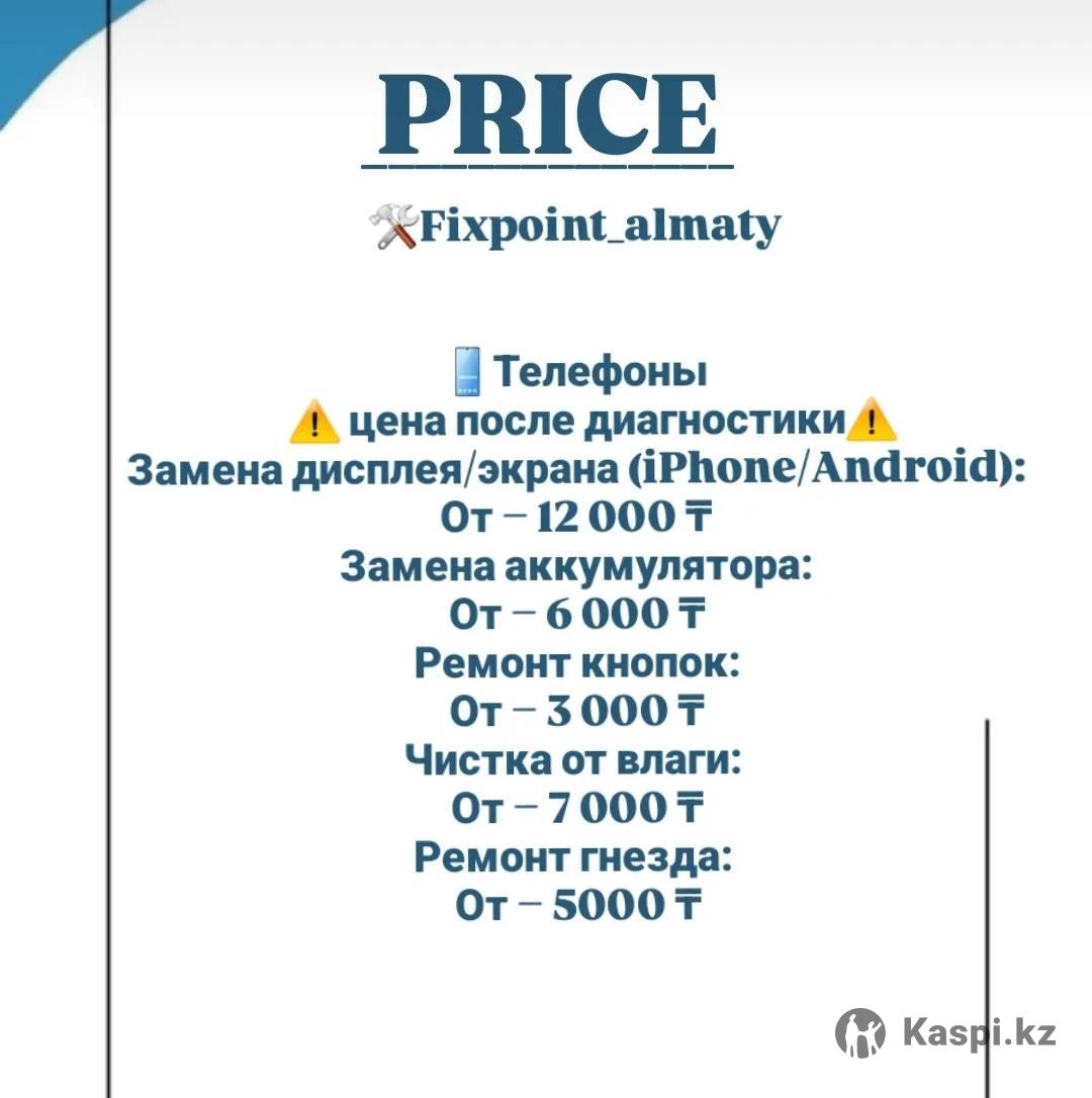 Ремонт телефонов, планшетов и замена экранов Алматы Профессиональный ремонт смартфонов всех марок: Работаю на дому и на выезд Прайс лист: 1.Замена экрана — от 12 000 тг 2.Замена батареи — от 6 000 тг 3.Замена разъема зарядки — от 5 000 тг 4.Прошивка / настройка — от 5 000 тг 5.Чистка от влаги 7000 тг 6.(диагностика бесплатно) Гарантия на все работы Быстро и аккуратно До конца октября скидка за работу 30% Работаю в Алматы. Пишите или звоните