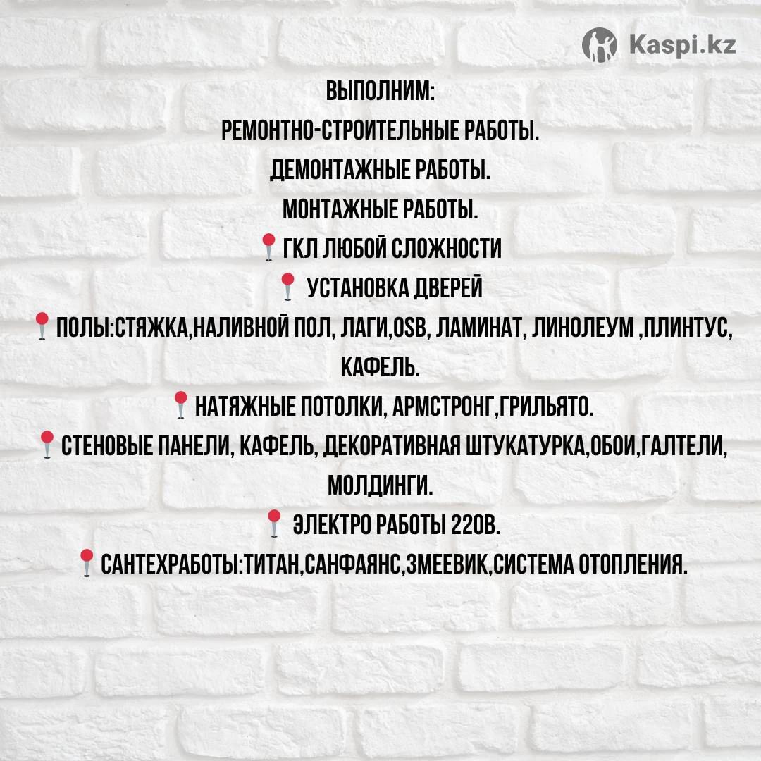 Ремонтно -строительные услуги, бригада специалистов выполнит все виды ремонтно -отделочных работ . Стаж работы более 20-и лет. Выезд к заказчику 5тысяч тенге.