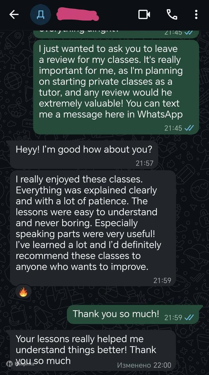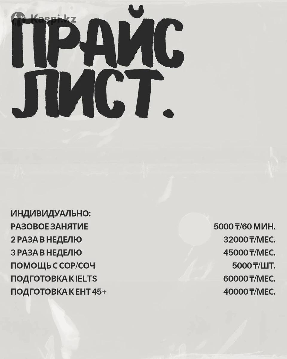 НЕ ЗВОНИТЬ! ТОЛЬКО ПЕРЕПИСКА! ЗВОНКИ НЕ ПРИНИМАЮ ВООБЩЕ! Уроки проходят только ОНЛАЙН. Преподаю английский для подростков и взрослых (от 17 лет). Работаю по грамотному, структурному подходу: объясняю грамматику нормально, человеческим языком, учу переводить, формировать речь с нуля и говорить уверенно. Мой уровень: C1 (IELTS 7.0), американский акцент. Учился по классическому учебнику Бонк - методика, проверенная временем. Без “воды” и пустых разговорных клубов. Что даю на занятиях: - грамматика с понятными объяснениями - перевод с/на английский - построение правильных предложений - разговорная практика по делу - помощь с СОР/СОЧ - подготовка к ЕНТ - подготовка к IELTS (повышение языковой компетенции на 1 уровень, например, с 4.0 до 5.0) График: Понедельник–пятница С 17:00 до 20:00 Пишите на W (номер указан в объявлении) Либо на каспи