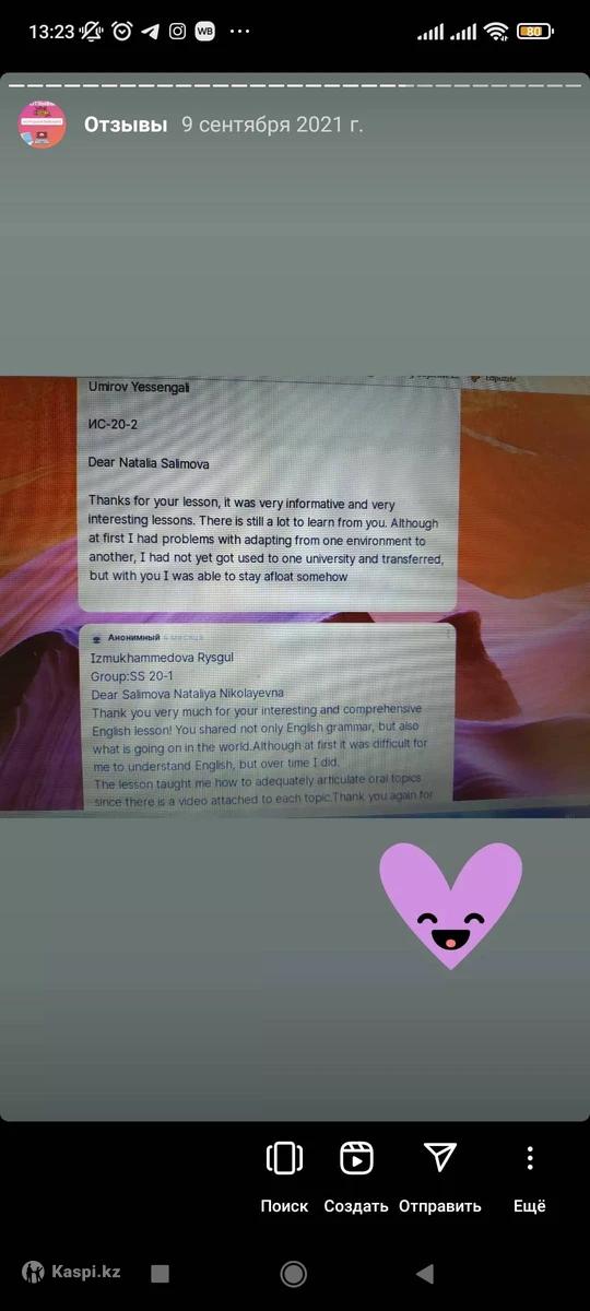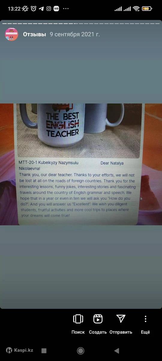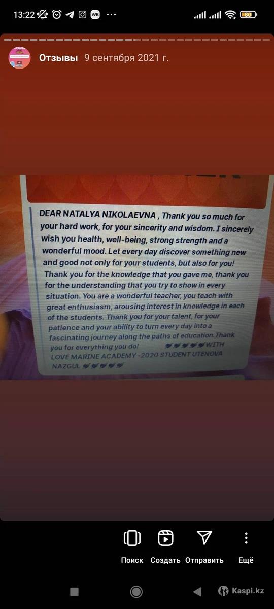 Hi there! Предлагаю окунуться в мир английского языка. Для онлайн урока нужен лишь компьютер/планшет и интернет соединение. Не нужно никуда ехать и стоять в пробках или мокнуть под дождем в непогоду. Плюс экономия времени. На моем онлайн уроке полная имитация офлайн класса, за счёт работы на цифровой доске Миро, я могу демонстрировать тексты и упражнения, проводить аудирование, ученик так же может писать предложения на доске и взаимодействовать с учителем и до учениками. Доступны прослушивания аудио и просмотр видео файлов. Также я использую дополнительные цифровые платформы, такие как Kahoot, flipgrid, quizzlet и прочее. Обо мне: Я, Наталья, более 12 лет опыта техническим переводчиком в ведущей нефтегазовой компании, более 17лет опыта синхронным и последовательным переводчиком для топ менеджеров и на международных конференциях. 20 лет работы преподавателем как на курсах ин яз так и онлайн. Предлагаю вам онлайн обучение английскому языку, все уровни, как для взрослых, в том числе нефтегазовый и бизнес английский, так и для школьников и студентов, начиная с 10 лет и старше. Своя методика - коммуникативный подход, 2 высших образования, диплом с отличием, магистратура в области методики преподавания иностранного языка, сертификат TESOL с правом преподавания английского в любой стране мира. Благодарственная грамота от Посольства США за ведение двухгодичного проекта Access Program для подростков из малообеспеченных семей. Благодарственное письмо от ректора Назарбаев Университета за трёх годичные курсы английского языка для учителей РК -STEM. Мотивирую, довожу до результата, уже более 170 отзывов на моей странице. Со мной обучение в радость. Количество мест ограничено, запишись на пробный урок сейчас.
