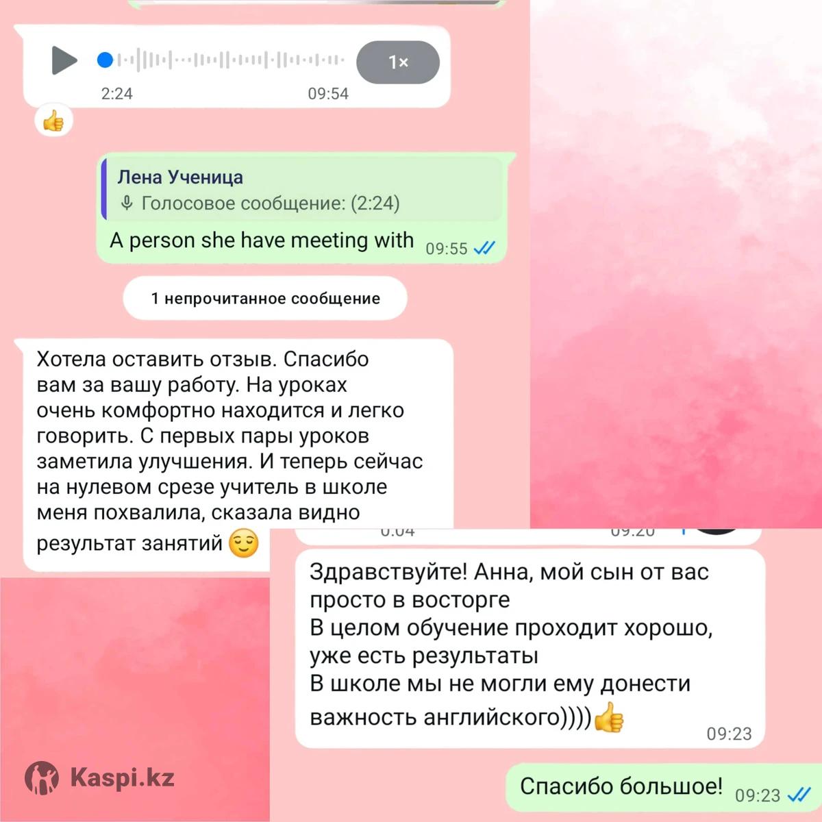 Добрый день! Меня зовут Анна. Знаю английский язык на уровне Uppermediate/Advanced и считаю его неотъемлемой частью моей жизни. Готова погрузить вас с головой в любовь к познанию! Имеется международный сертификат IELTS (7.0) Получила средне-специальное образование в области преподавания. Опыт преподавания-год. Что вы увидите на моих уроках: •Только инновационные всемирно доказанные методы обучения, гарантированно приносящие результат в учебе и работе •Подготовка к IELTS, ведущая к полному пониманию структуры и требований теста •Свободная разговорная практика, позволяющая преодолеть стеснение и различные барьеры •Поддержка и ценность ученика как личности •Индивидуальный подход-адаптация ресурсов под интересы •Помощь с домашним заданием, подготовка к проверочным работам •Получение возможности понимать и использовать в своих целях любой контент на английском языке •Консультация в любое время, по интересующим вас вопросам относительно языка Формат: онлайн(Zoom) Цена: 3500 тг за час. Пробный урок бесплатно. Репетитор по английскому языку