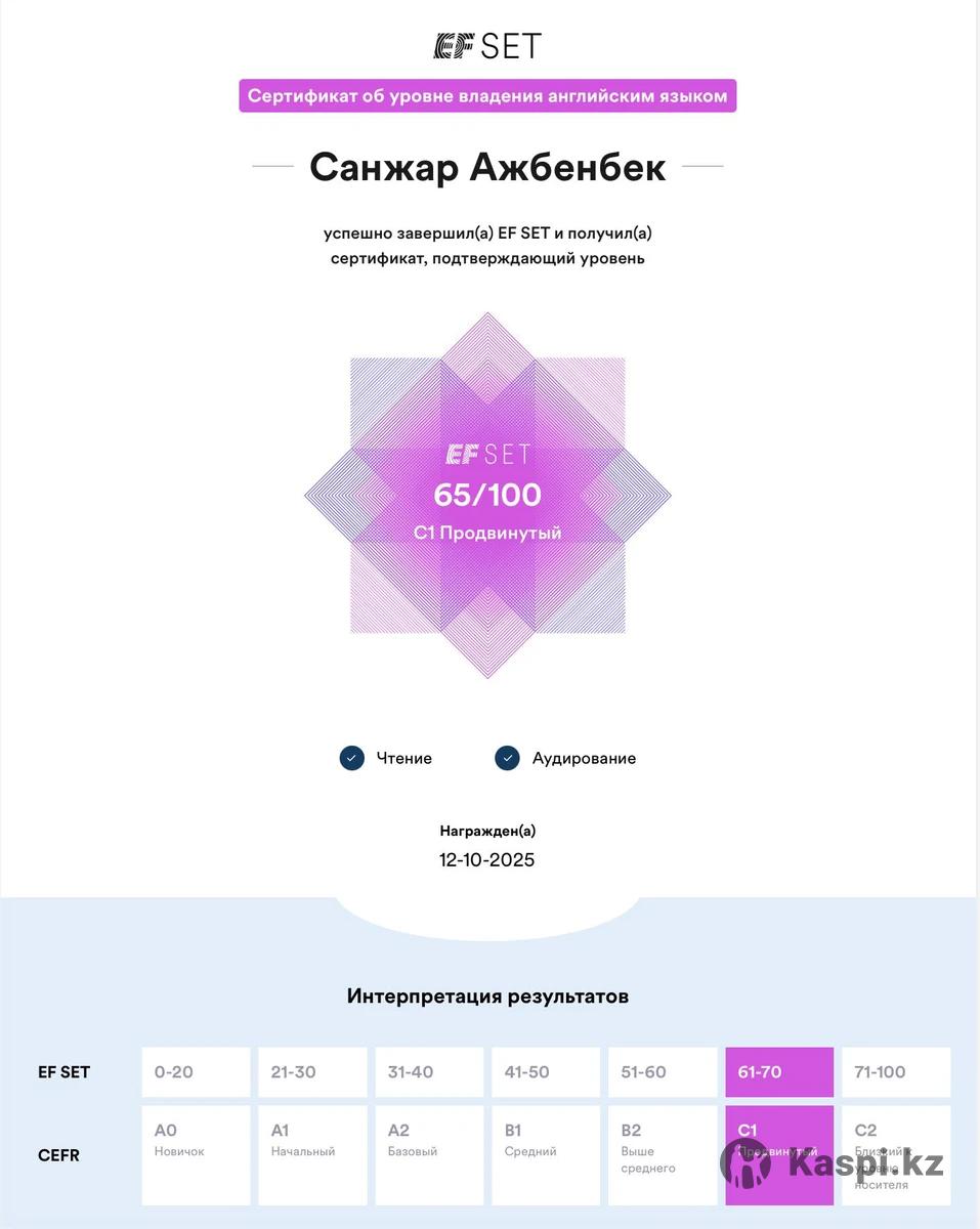 Здравствуйте, меня зовут Санжар. Я студент 3 курса SDU. Уровень английского - C1 (Advanced). Имею опыт пребывания в США, что помогло значительно улучшить разговорную практику и понимание живого английского языка. Помогаю школьникам и начинающим: • улучшить грамматику • развить разговорную речь • расширить словарный запас • подготовиться к тестам и контрольным • уверенно понимать английскую речь Объясняю материал простым и понятным языком, делаю упор на практику и результат. Подбираю индивидуальный подход к каждому ученику. Занятия проходят онлайн.