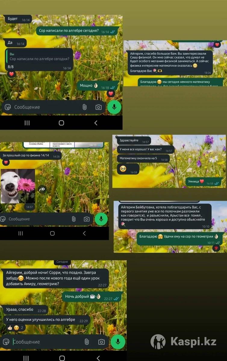 Предметы: Физика ,Алгебра и Геометрия Образование: • Назарбаев Интеллектуальная Школа. • Казахский Национальный Университет имени Аль-Фараби, факультет физико-технический, специальность - физика. • Казахский Национальный Университет имени Аль-Фараби, факультет механико-математический, специальность – математика. Опыт: • Репетитор — более 12 лет Уровни подготовки: - Школьная программа с 5 по 11кл - Подготовка к ЕНТ, ЕГЭ - Подготовка в НИШ - Подготовка в РФМШ - Подготовка в БИЛ/КТЛ Преподаю дистанционно. Платформа: Google meet, Яндекс телемост, Microsoft Teams, zoom. Преподаю на русском языке 🖋️ Стоимость моих услуг👇🏼 Индивидуально - 6000тг Мини группы (до 3-х человек) - 4000тг Длительность урока 60мин Первый пробный урок длительность 40мин, стоимость 4000тг. Айгерим Бейбутовна👩🏻💻