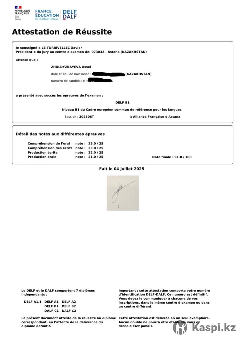 Репетитор по французскому языку (начальный- средний уровень) Объясню основы французского языка просто и понятно. Помогу начать говорить, читать и разбираться в грамматике. Индивидуальный подход. 📍 Занятия проходят: — Онлайн: Zoom, Google Meet — Оффлайн в Астане (возможен выезд, либо встреча в удобном месте — библиотека, коворкинг и др.) — Я всегда стараюсь подстроиться под ваш комфортный формат и график. – Сдала экзамен DELF B1 на 91/100 ⸻ 💰 Стоимость занятий (английский и французский языки): — Индивидуальное занятие (60 мин) —4000 тг — Индивидуальное занятие (90 мин) —5500 тг — Мини-группа (2 человека, 60 мин) —3000 тг с ученика — Интенсив (120 мин) —7000 тг — Пробное занятие — 3000 тг 🎁 Скидка 7% при оплате за месяц вперед (от 8 занятий) ⸻ 🗓 Гибкий график: утро, день, вечер — по договоренности. Работаю с учениками любого возраста, главное — ваше желание учиться!