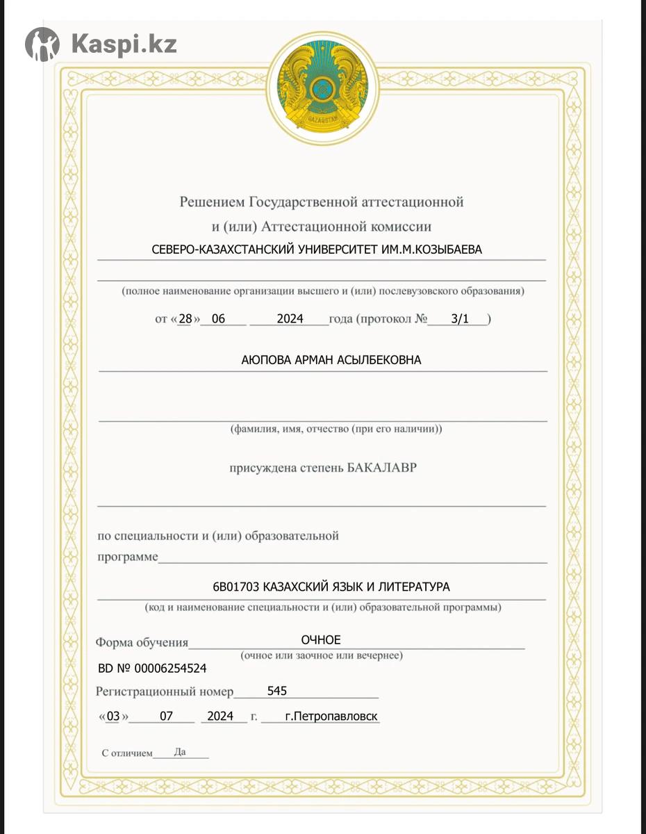 Преподаю казахский язык с любовью и уважением к каждому ученику. — Индивидуальный подход к каждому ученику. — Использую современные дидактические материалы, визуальные карточки и коммуникативную методику. — Помогаю выстроить системное понимание языка, развить устную речь и уверенность при общении. — Обучаю в удобном темпе, с учетом возраста и целей ученика. — На уроках мы не зубрим, а понимаем язык: говорим, слушаем, играем и используем визуальные материалы. — Обучение онлайн на удобных для вас платформах Я действующий педагог в школе-колледже. Имею высшее педагогическое образование. Педагогический стаж 1,5 года. Провожу пробное занятие бесплатно