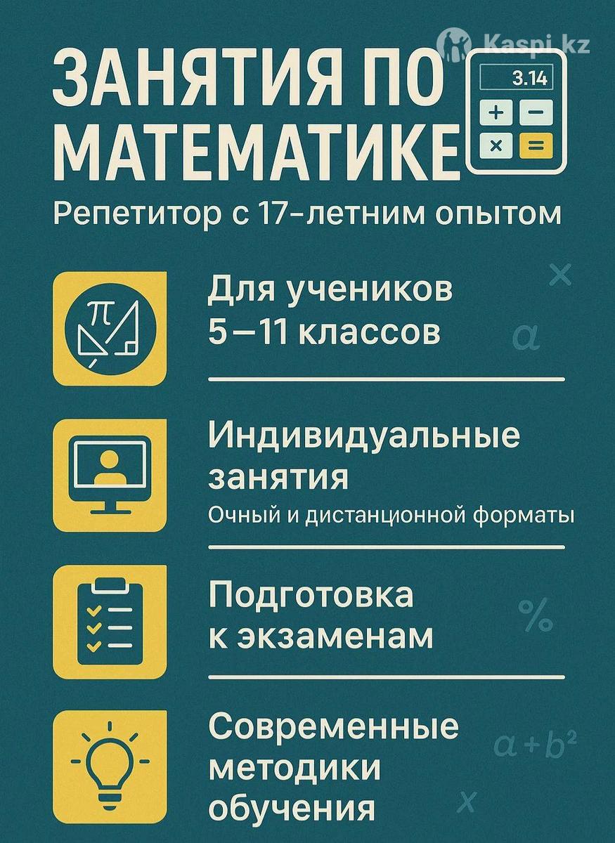 Репетитор с 17- летним опытом преподавания 🔹 Подготовка к основным экзаменам: ЕНТ, НИШ, БИЛ 🔹 Работаю с учащимися 5–11 классов. Помощь в освоении школьной программы, устранение пробелов, развитие логического мышления. 🔹 Используются современные методики обучения, направленные на понимание, а не просто запоминание. Язык преподавания: русский,казахский