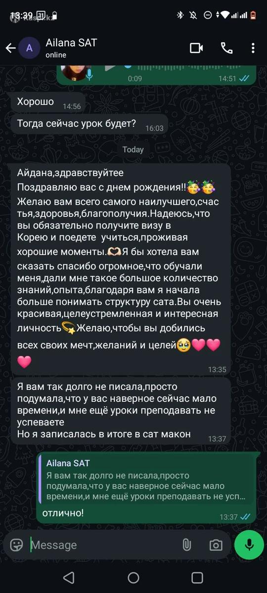 Математика, химия и физика без паники — онлайн в Google Meet. Пробный урок бесплатно. Обо мне: студентка в Корее, 2 года преподаю. Выпускница НИШ ХБН Алматы. SAT 1550, IELTS 8.0, GPA 5.0. Делаю сложные темы простыми, пробелы закрываю системно. Формат: только онлайн (Google Meet), интерактивная доска и материалы в доступе. Занятия 60–90 минут, удобный график. Кому подойдет: ученики 5–11(12) классов и первокурсники, кому нужно подтянуть программу, подготовиться к контрольной/зачету или разобраться с темами «с нуля». Как работаю: бесплатный пробный урок и диагностика уровня, индивидуальный план под цели ученика. На занятии — теория по делу, разбор задач, мини-итог. Домашние задания с обратной связью. Стоимость: 4000 тг/час. Оплата за месяц вперед (после пробного). 2 раза в неделю — 32 000 тг, 3 раза в неделю — 48 000 тг. Отзывы могу отправить в личку. Результативность гарантирована.