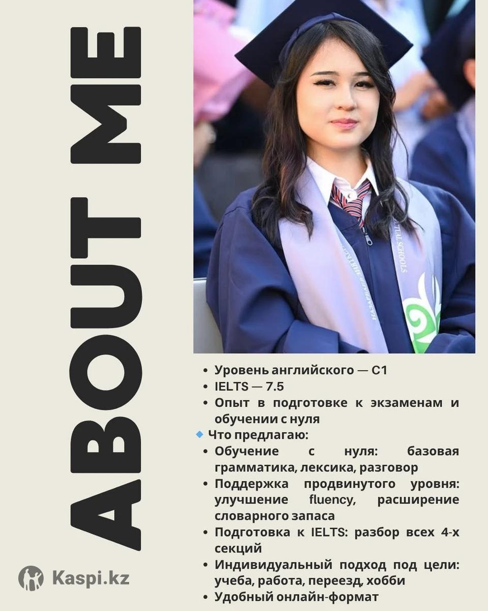 Услуги репетитора по английскому языку 📚 Для начинающих и продолжающих 🔹 Обо мне: •Уровень английского — C1 •IELTS — 7.5 • Выпускница НИШ 🔹 Что предлагаю: •Обучение с нуля: базовая грамматика, лексика, разговор •Поддержка продвинутого уровня: улучшение fluency, расширение словарного запаса •Подготовка к IELTS •Индивидуальный подход под цели: учеба, работа, переезд, хобби •Удобный онлайн-формат по Zoom, microsoft teams