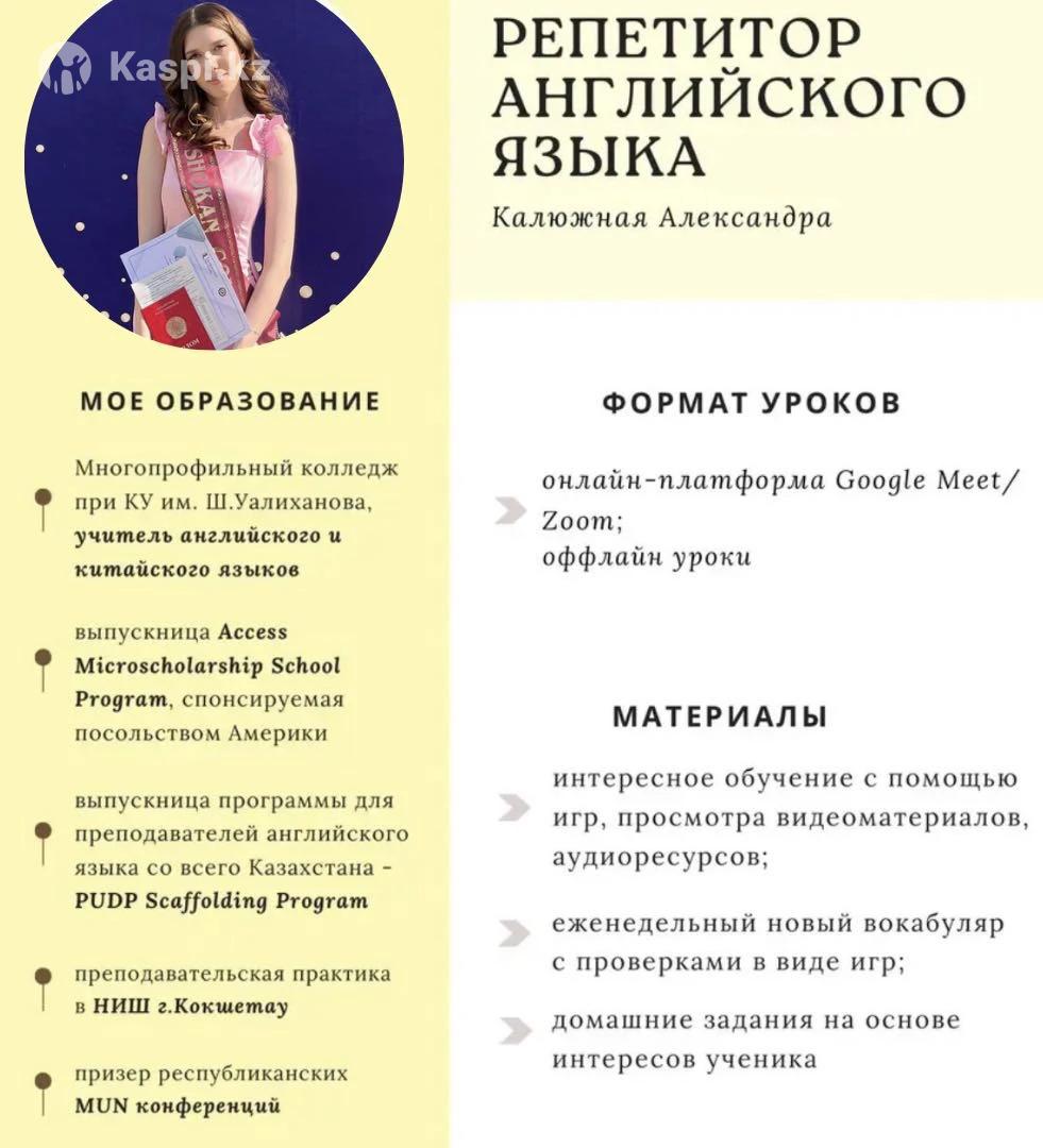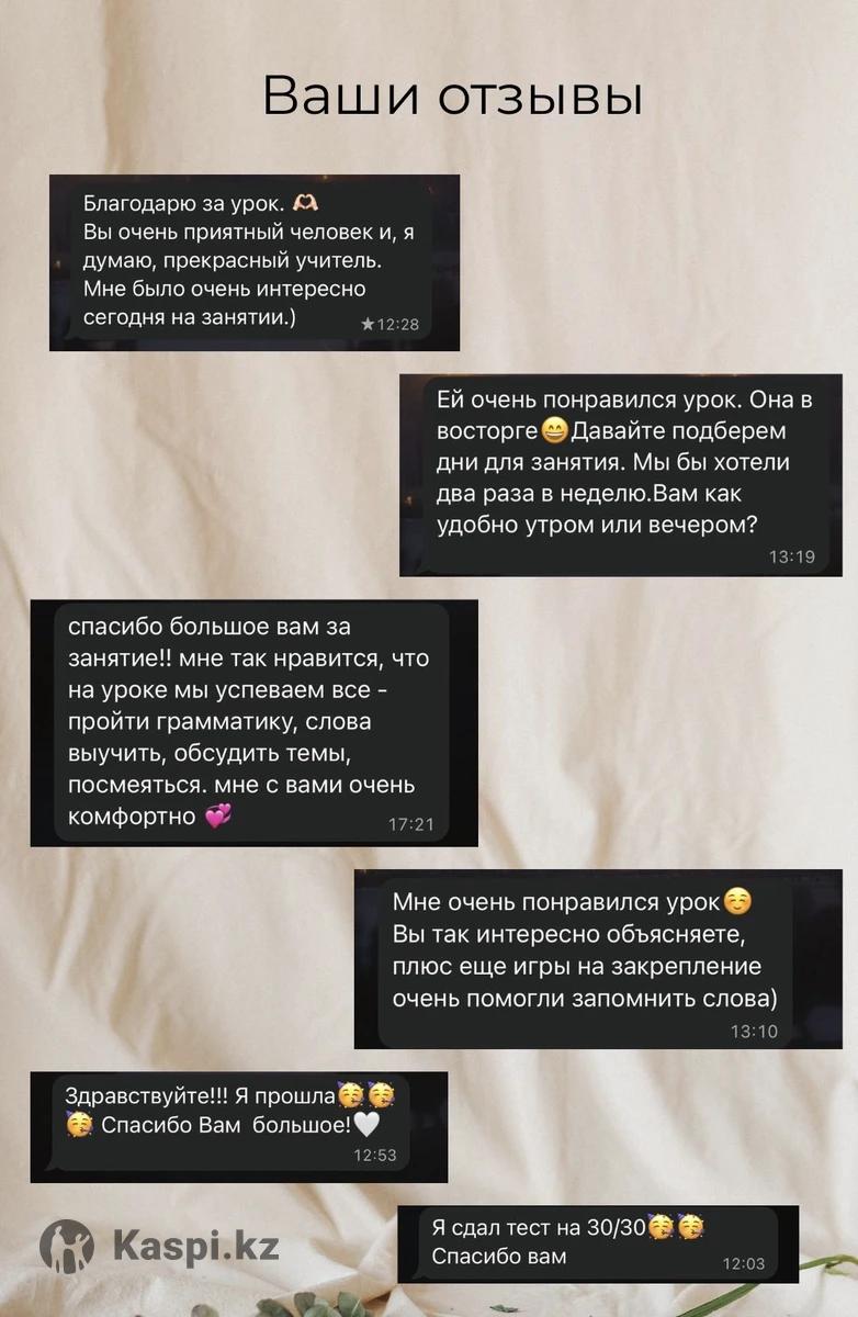 Занятия по английскому языку для любых возрастов. 📚Стоимость одного занятия - 3.000 тенге Парного - 2.500 (двое на занятии) ☘️Продолжительность занятия 1 час. 🌸ФОРМАТ УРОКОВ: • онлайн-платформа Google Meet • speaking club на каждой неделе ✨Что Вас ожидает? • интересное обучение с помощью просмотра видеоматериалов, игр, аудиоресурсов; • еженедельный новый вокабуляр с проверками в виде игр; • домашние задания на основе интересов ученика • подбор учебной программы на основе Ваших желаний и уровня ПЕРВОЕ ПРОБНОЕ ЗАНЯТИЕ - БЕСПЛАТНОЕ