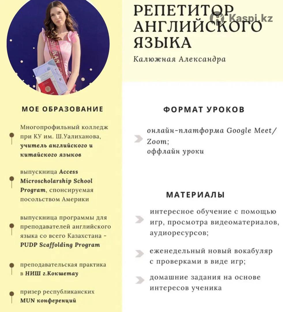 📚Стоимость одного занятия - 3.000 тенге Парного - 2.500 (двое на занятии) ☘️Продолжительность занятия 1 час. 🌸ФОРМАТ УРОКОВ: • онлайн-платформа Google Meet • speaking club на каждой неделе ✨Что Вас ожидает? • интересное обучение с помощью просмотра видеоматериалов, игр, аудиоресурсов; • еженедельный новый вокабуляр с проверками в виде игр; • домашние задания на основе интересов ученика • подбор учебной программы на основе Ваших желаний и уровня ПЕРВОЕ ПРОБНОЕ ЗАНЯТИЕ - БЕСПЛАТНОЕ