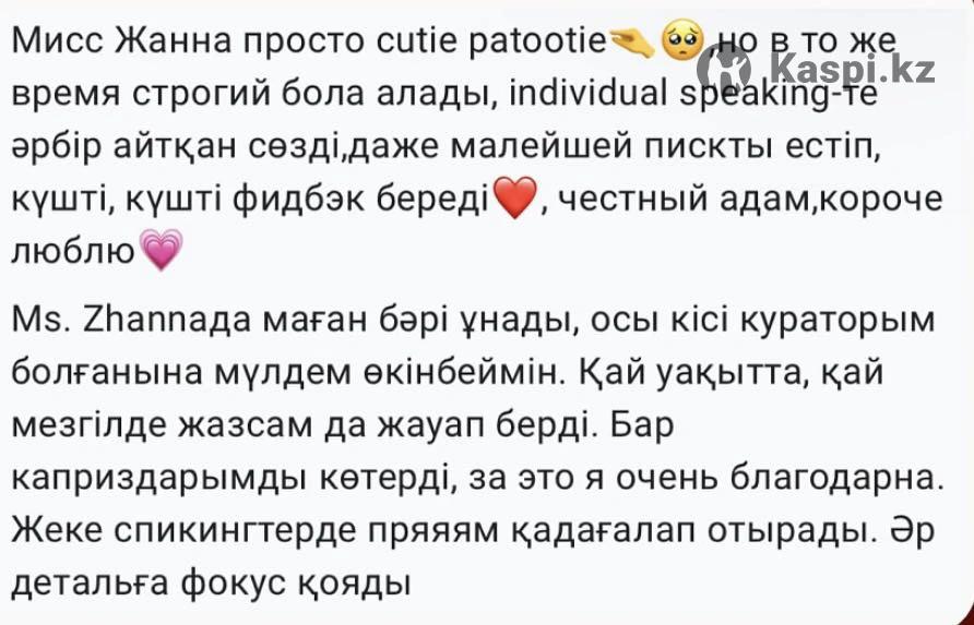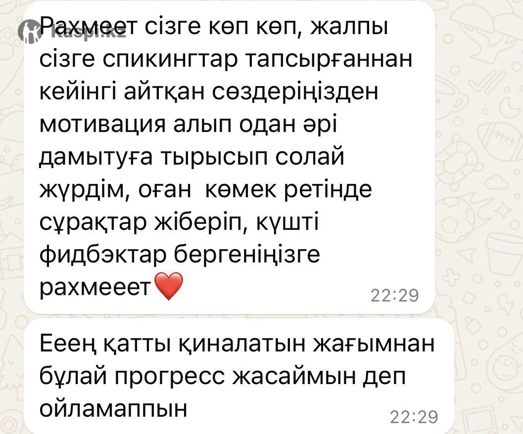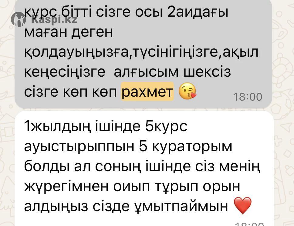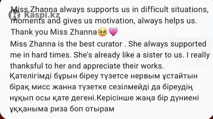 Меня зовут Жанна - студентка “SDU University”. Учусь по професий “Два иностраных языка”. Помогу заговорить на английском и развить всех основных навыков: говорение, чтение, аудирование и письмо. Обучаю интенсивно. 📌Опыт работы - Более 1 года (отзыв учеников на карусели) - IELTS 7.0 📌Формат обучение: - Онлайн/оффлайн - Индивидуально/групповой Бесплатный пробный урок🎁 Для подробной информаций: