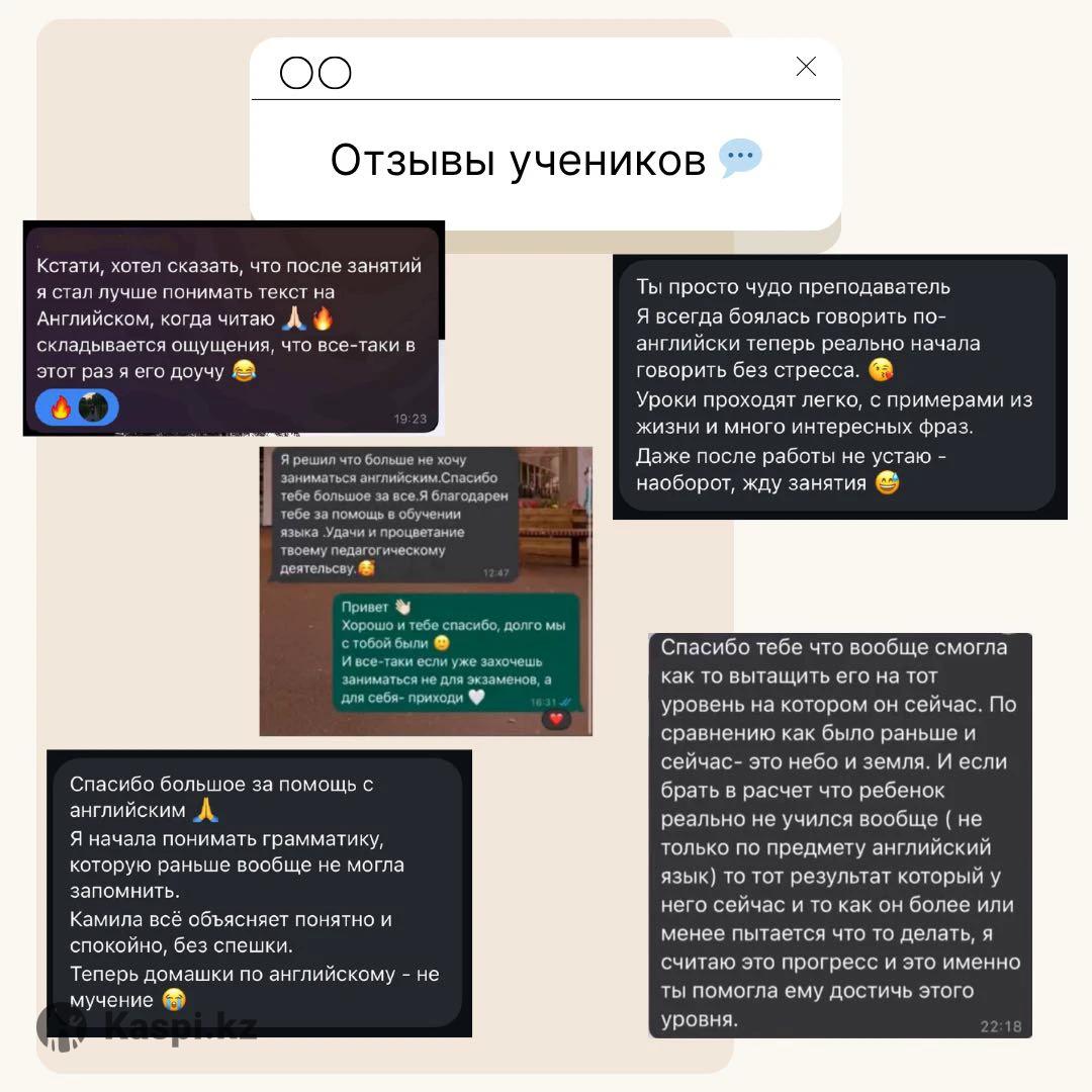 Помогаю школьникам и взрослым разобраться в грамматике, начать говорить уверенно и использовать английский в жизни, а не только в учебниках. 📘 Что предлагаю: • Индивидуальные уроки онлайн • Помощь с домашними заданиями • Консультации по произношению, грамматике и разговору • Подготовка к экзаменам и тестам Формат занятий - удобный, современный и без зубрежки. 💸 Стоимость - индивидуально, в зависимости от целей занятий. 📱 Пишите в или - отвечаю быстро! Онлайн-обучение доступно для всех регионов Казахстана.