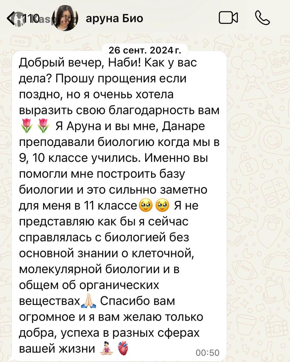 Опытный репетитор с образованием в ведущих вузах Южной Кореи: •*бакалавр Yonsei University (Биотехнология) •магистрант KAIST (Korea Advanced Institute of Science and Technology). •Научная Стажировка в Университете Гонконга (HKU), лаборатория эндокринологии и молекулярной биологии. •Выпускник Назарбаев Интеллектуальной школы (НИШ ХБН), г. Петропавловск. Мои результаты: • ЕНТ — 139/140 (биология, химия). • IELTS — 7.5 C1, Advanced • SAT — 1470/1600 (Math — 790/800). • МЭСК (эквивалент A-Level/GCSE) — A+ по химии и биологии (экзамен на английском языке). • Стажировка в Университете Гонконга (HKU), лаборатория эндокринологии и молекулярной биологии. Тема исследования — биомаркеры для диагностики хронической крапивницы. -Провожу углубленные занятия по химии и биологии (молекулярная и клеточная биология, биологии рака/биология онкологии, генетика и иммунология) на англ/каз/рус -Объясняю сложные темы просто и наглядно, с примерами и визуализациями. -После каждого урока ученики получают PDF-конспект со всеми записями и видео запись урока для повторения -Регулярно выдаю домашние работы с детальной обратной связью, веду контроль прогресса —еженедельные отчеты и индивидуальная адаптация программы. -Учитываю цели каждого ученика. подготовка к экзаменам, поступление в университет или получение грантов. Школьная программа •Индивидуально — 7 000 тг/час •В паре — 4 000 тг/час Университетская программа •Индивидуально — 9 000 тг/час Формат занятий: онлайн (Microsoft Teams)