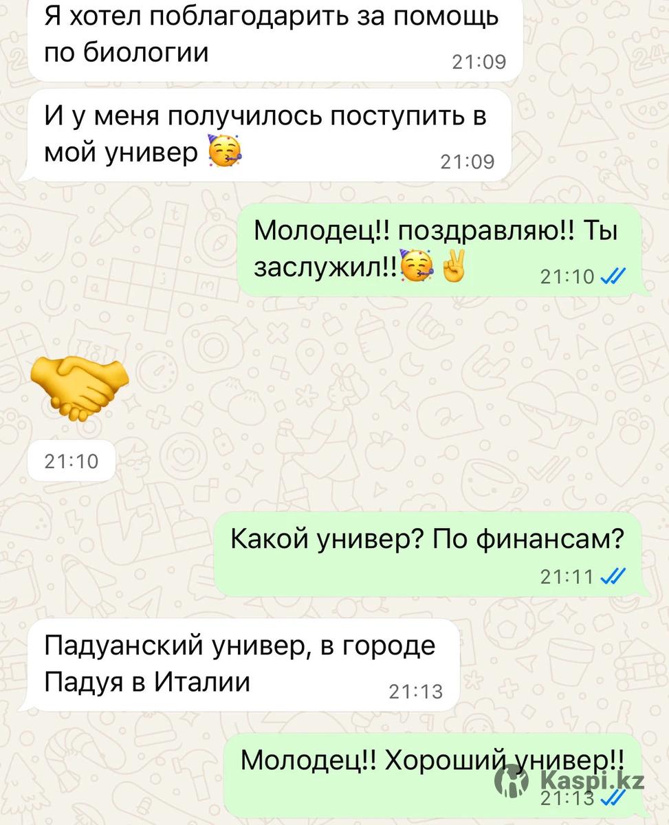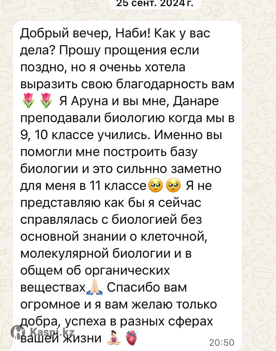 Обо мне • Бакалавр Yonsei University (Южная Корея), специальность «Биотехнология» (обучение по гранту). • Магистрант KAIST (Korea Advanced Institute of Science and Technology), Южная Корея (обучение по гранту). • Выпускник Назарбаев Интеллектуальной школы (НИШ ХБН), г. Петропавловск. Достижения и экзамены • ЕНТ — 139/140 (биология, химия). • IELTS — 7.5 C1, Advanced • SAT — 1470/1600 (Math — 790/800). • МЭСК (эквивалент A-Level/GCSE) — A+ по химии и биологии (экзамен на английском языке). • Стажировка в Университете Гонконга (HKU), лаборатория эндокринологии и молекулярной биологии. Тема исследования — биомаркеры для диагностики хронической крапивницы. Чем могу помочь • Подготовка к экзаменам: ЕНТ, МЭСК, IELTS, SAT (биология, химия, английский язык, математика). • Подготовка по школьной и университетской программе (химия и биология) на казахском, русском, английском языках. • Объяснение сложных тем и разбор трудных вопросов по предмету. Молекулярная биология, Клеточная биология, Биология рака, Генетика, Иммунология • Составление индивидуальной стратегии подготовки к экзаменам, грантам и стипендиям. Школьная программа •Индивидуально — 7 000 тг/час •В паре — 4 000 тг/час Университетская программа •Индивидуально — 9 000 тг/час Формат занятий: онлайн (Microsoft Teams)