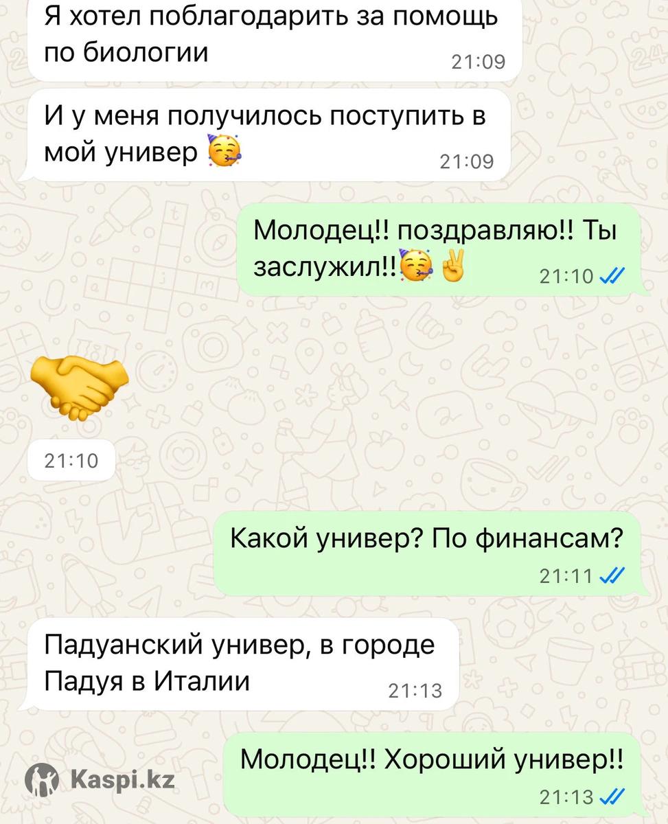 Обо мне • Бакалавр Yonsei University (Южная Корея), специальность «Биотехнология» (обучение по гранту). • Магистрант KAIST (Korea Advanced Institute of Science and Technology), Южная Корея (обучение по гранту). • Выпускник Назарбаев Интеллектуальной школы (НИШ ХБН), г. Петропавловск. Достижения и экзамены • ЕНТ — 139/140 (биология, химия). • IELTS — 7.5 C1, Advanced • SAT — 1470/1600 (Math — 790/800). • МЭСК (эквивалент A-Level/GCSE) — A+ по химии и биологии (экзамен на английском языке). • Стажировка в Университете Гонконга (HKU), лаборатория эндокринологии и молекулярной биологии. Тема исследования — биомаркеры для диагностики хронической крапивницы. Чем могу помочь • Подготовка к экзаменам: ЕНТ, МЭСК, IELTS, SAT (биология, химия, английский язык, математика). • Подготовка по школьной и университетской программе (химия и биология) на казахском, русском, английском языках. • Объяснение сложных тем и разбор трудных вопросов по предмету. Молекулярная биология, Клеточная биология, Биология рака, Генетика, Иммунология • Составление индивидуальной стратегии подготовки к экзаменам, грантам и стипендиям. Школьная программа •Индивидуально — 7 000 тг/час •В паре — 4 000 тг/час Университетская программа •Индивидуально — 9 000 тг/час Формат занятий: онлайн (Microsoft Teams)