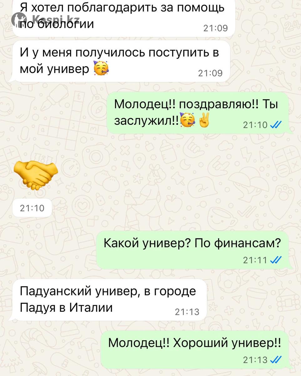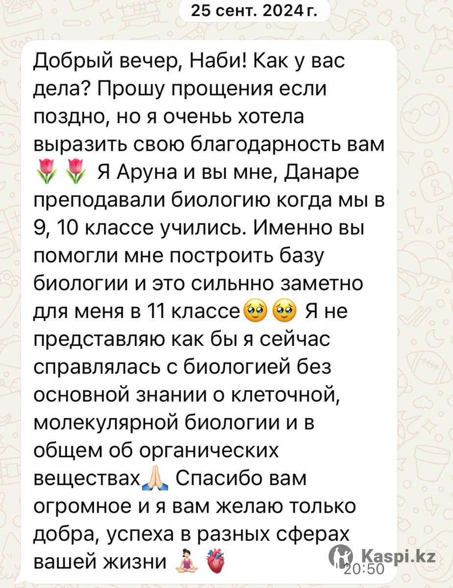 Опытный репетитор с образованием в ведущих вузах Южной Кореи: •бакалавр Yonsei University (Биотехнология) •магистрант KAIST (Korea Advanced Institute of Science and Technology). •Научная Стажировка в Университете Гонконга (HKU), лаборатория эндокринологии и молекулярной биологии. •Выпускник Назарбаев Интеллектуальной школы (НИШ ХБН), г. Петропавловск. Мои результаты: • ЕНТ — 139/140 (биология, химия). • IELTS — 7.5 C1, Advanced • SAT — 1470/1600 (Math — 790/800). • МЭСК (эквивалент A-Level/GCSE) — A+ по химии и биологии (экзамен на английском языке). • Стажировка в Университете Гонконга (HKU), лаборатория эндокринологии и молекулярной биологии. Тема исследования — биомаркеры для диагностики хронической крапивницы. -Провожу углубленные занятия по химии и биологии (молекулярная и клеточная биология, биологии рака/биология онкологии, генетика и иммунология) на англ/каз/рус -Объясняю сложные темы просто и наглядно, с примерами и визуализациями. -После каждого урока ученики получают PDF-конспект со всеми записями и видео запись урока для повторения -Регулярно выдаю домашние работы с детальной обратной связью, веду контроль прогресса —еженедельные отчеты и индивидуальная адаптация программы. -Учитываю цели каждого ученика. подготовка к экзаменам, поступление в университет или получение грантов. Школьная программа •Индивидуально — 7 000 тг/час •В паре — 4 000 тг/час Университетская программа •Индивидуально — 9 000 тг/час Формат занятий: онлайн (Microsoft Teams)