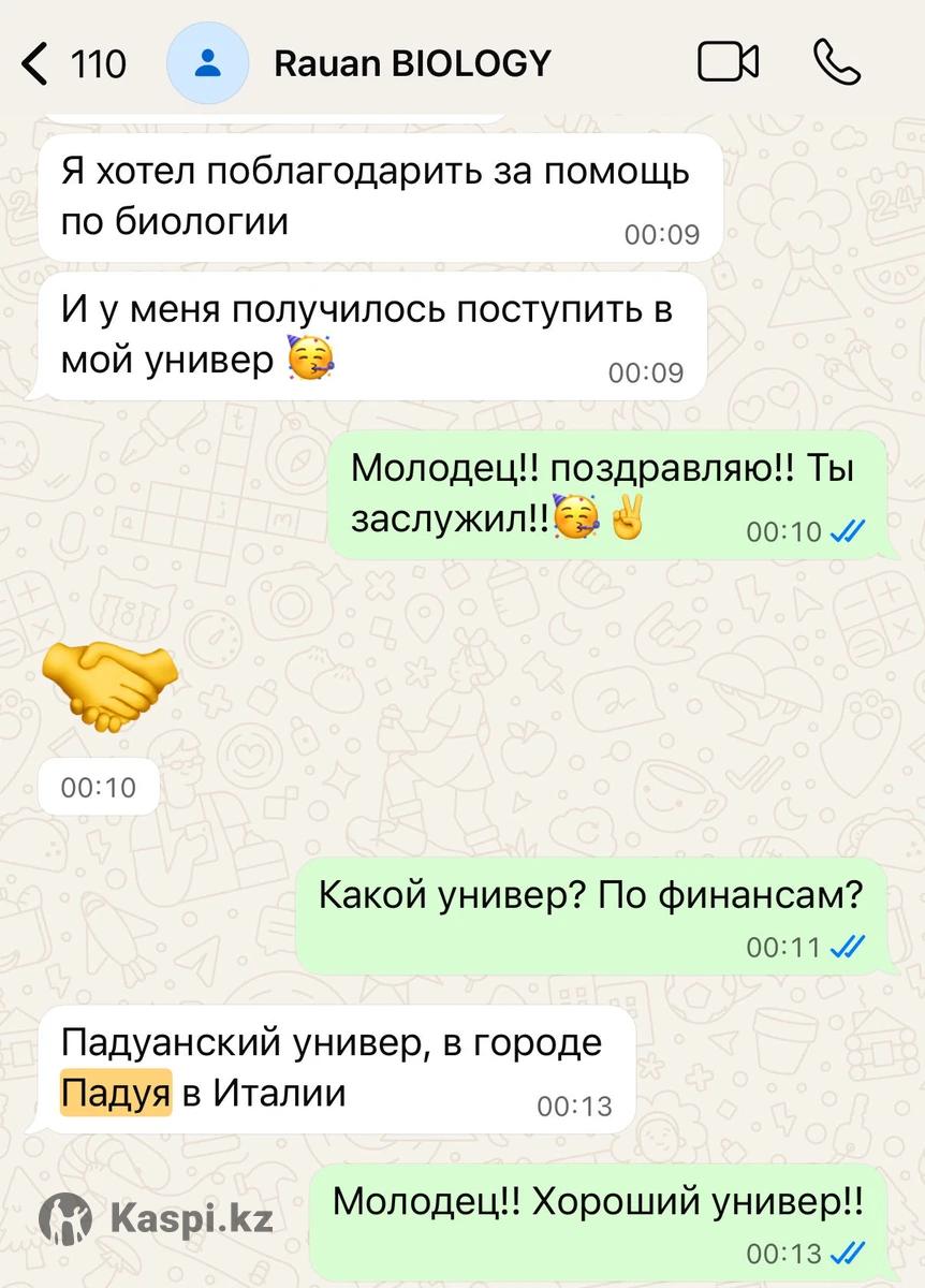 Опытный репетитор с образованием в ведущих вузах Южной Кореи: •*бакалавр Yonsei University (Биотехнология) •магистрант KAIST (Korea Advanced Institute of Science and Technology). •Научная Стажировка в Университете Гонконга (HKU), лаборатория эндокринологии и молекулярной биологии. •Выпускник Назарбаев Интеллектуальной школы (НИШ ХБН), г. Петропавловск. Мои результаты: • ЕНТ — 139/140 (биология, химия). • IELTS — 7.5 C1, Advanced • SAT — 1470/1600 (Math — 790/800). • МЭСК (эквивалент A-Level/GCSE) — A+ по химии и биологии (экзамен на английском языке). • Стажировка в Университете Гонконга (HKU), лаборатория эндокринологии и молекулярной биологии. Тема исследования — биомаркеры для диагностики хронической крапивницы. -Провожу углубленные занятия по химии и биологии (молекулярная и клеточная биология, биологии рака/биология онкологии, генетика и иммунология) на англ/каз/рус -Объясняю сложные темы просто и наглядно, с примерами и визуализациями. -После каждого урока ученики получают PDF-конспект со всеми записями и видео запись урока для повторения -Регулярно выдаю домашние работы с детальной обратной связью, веду контроль прогресса —еженедельные отчеты и индивидуальная адаптация программы. -Учитываю цели каждого ученика. подготовка к экзаменам, поступление в университет или получение грантов. Школьная программа •Индивидуально — 7 000 тг/час •В паре — 4 000 тг/час Университетская программа •Индивидуально — 9 000 тг/час Формат занятий: онлайн (Microsoft Teams)