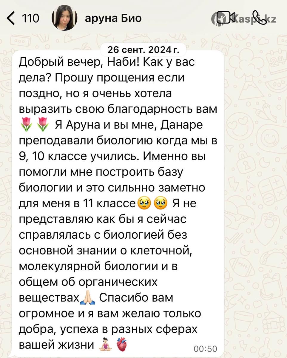 Опытный репетитор с образованием в ведущих вузах Южной Кореи: •*бакалавр Yonsei University (Биотехнология) •магистрант KAIST (Korea Advanced Institute of Science and Technology). •Научная Стажировка в Университете Гонконга (HKU), лаборатория эндокринологии и молекулярной биологии. •Выпускник Назарбаев Интеллектуальной школы (НИШ ХБН), г. Петропавловск. Мои результаты: • ЕНТ — 139/140 (биология, химия). • IELTS — 7.5 C1, Advanced • SAT — 1470/1600 (Math — 790/800). • МЭСК (эквивалент A-Level/GCSE) — A+ по химии и биологии (экзамен на английском языке). • Стажировка в Университете Гонконга (HKU), лаборатория эндокринологии и молекулярной биологии. Тема исследования — биомаркеры для диагностики хронической крапивницы. -Провожу углубленные занятия по химии и биологии (молекулярная и клеточная биология, биологии рака/биология онкологии, генетика и иммунология) на англ/каз/рус -Объясняю сложные темы просто и наглядно, с примерами и визуализациями. -После каждого урока ученики получают PDF-конспект со всеми записями и видео запись урока для повторения -Регулярно выдаю домашние работы с детальной обратной связью, веду контроль прогресса —еженедельные отчеты и индивидуальная адаптация программы. -Учитываю цели каждого ученика. подготовка к экзаменам, поступление в университет или получение грантов. Школьная программа •Индивидуально — 7 000 тг/час •В паре — 4 000 тг/час Университетская программа •Индивидуально — 9 000 тг/час Формат занятий: онлайн (Microsoft Teams)