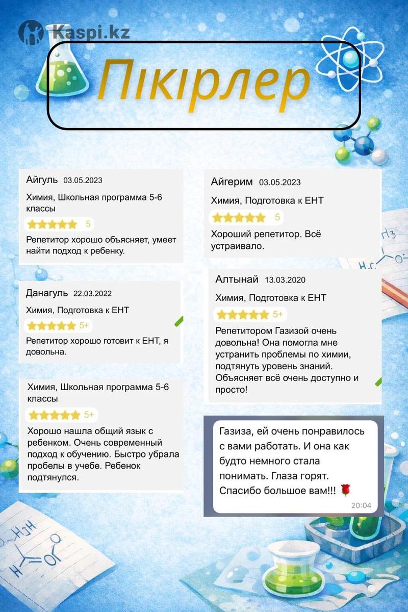 Есть диплом высший Опыт работы 5 лет Работаю с 7-11 классами, готовлю к ЕНТ, помогаю поднять уровень знаний по предмету На фото отзывы по моей работе Преподаю онлайн на платформе zoom От меня все материалы Для подробности напишите или позвоните по номеру