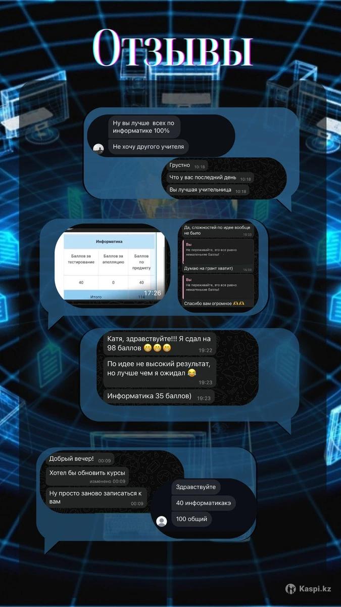 Готовлю школьников 10–11 кл. к ЕНТ и вступительным экзаменам в вузы РФ. ✨ Первое занятие на выбор: — бесплатная встреча (20 мин, диагностика) — урок −50% (60 мин, 3000 тг) 🎓 Образование: бакалавриат и магистратура с отличием, Томский госуниверситет. 📚 Опыт: преподаватель ТГУ (основы программирования), младший научный сотрудник (2 года), центр ЕНТ, репетиторство 2+ года. 📈 На занятиях: теория + практика, тесты и домашки с автоматической проверкой, контроль прогресса. 💰 Стоимость: — индивидуально: 6000 тг — в паре: 4000 тг/ученик — мини-группа (3–5 чел.): 3000 тг/ученик ✨ Скидка −10% на абонемент (12 занятий). 📍 Работаю онлайн по всему Казахстану. 💬 Пишите в чат — отвечаю быстро.