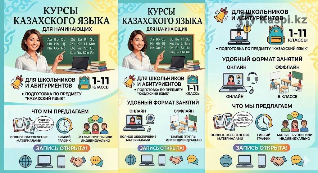 📚 Бастауыш деңгейге арналған қазақ тілі курстары 👩🏫 Учитель поможет ученикам с 1 по 11 класс по предмету "Казахский язык". 👩🏫 Мұғалім 1–11 сынып оқушыларын "Қазақ тілі" пәні бойынша дайындайды. 📖 Что предлагается / Не ұсынылады • Обучение казахскому языку с нуля • Қазақ тілін бастапқы деңгейден үйрету • Помощь в школьной программе • Мектеп бағдарламасы бойынша көмек • Индивидуальный подход к каждому ученику • Әр оқушыға жеке тәсіл 💻 Формат занятий / Сабақ форматы ✔ Онлайн занятия ✔ Онлайн сабақтар ✔ Оффлайн занятия ✔ Оффлайн сабақтар 📚 Материалы / Материалдар ✅ Учитель обеспечивает всеми учебными материалами ✅ Мұғалім барлық оқу материалдарымен қамтамасыз етеді 👨🎓 Для кого / Кімдер үшін • Ученики 1–11 классов • 1–11 сынып оқушылары • Начинающий уровень • Бастапқы деңгей