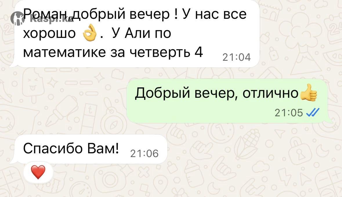 Здравствуйте! Я — студент выпускного курса специальности «Учитель математики». Помогаю школьникам 5–11 классов и студентам разобраться в трудных темах и подготовиться к СОР, СОЧ и экзаменам, включая ЕНТ. Опыт работы и индивидуальный подход к каждому ученику. Занятия возможны у вас, на моей территории или онлайн. Стоимость: 5000 тенге в час. Для записи и подробностей — звоните или пишите в личные сообщения