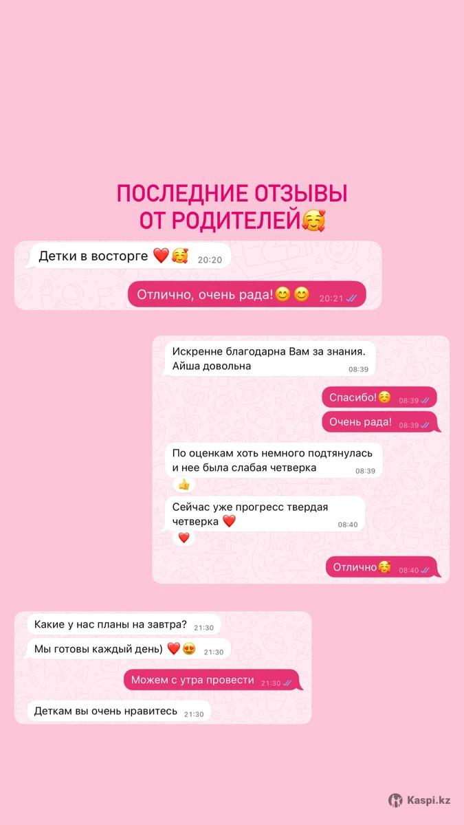 Индивидуальные онлайн-занятия по математике, алгебре и геометрии (1–11 классы). Объясняю просто и логично — так, чтобы ученик понимал тему, а не заучивал формулы 🧠 Работаю по американской стратегии I Do – We Do – You Do: сначала показываю и объясняю, затем решаем вместе, после чего ученик уверенно справляется самостоятельно ✅ Меня зовут Дарья. Я обладательница «Алтын белгі», сдала ЕНТ на 119 баллов (45 — математика) и обучаюсь на гранте в Astana IT University 🎓 Легко нахожу общий язык с детьми и помогаю разобраться даже в сложных темах 🙂 Началась 3 четверть — отличное время, чтобы подтянуть математику и закрыть пробелы 📈 🎁 Сейчас действует скидка 15% на абонементы на индивидуальные и парные занятия с фиксированным расписанием и простым, логичным объяснением тем. Также доступен формат разовых занятий. 📞 Подробности и запись по номеру: