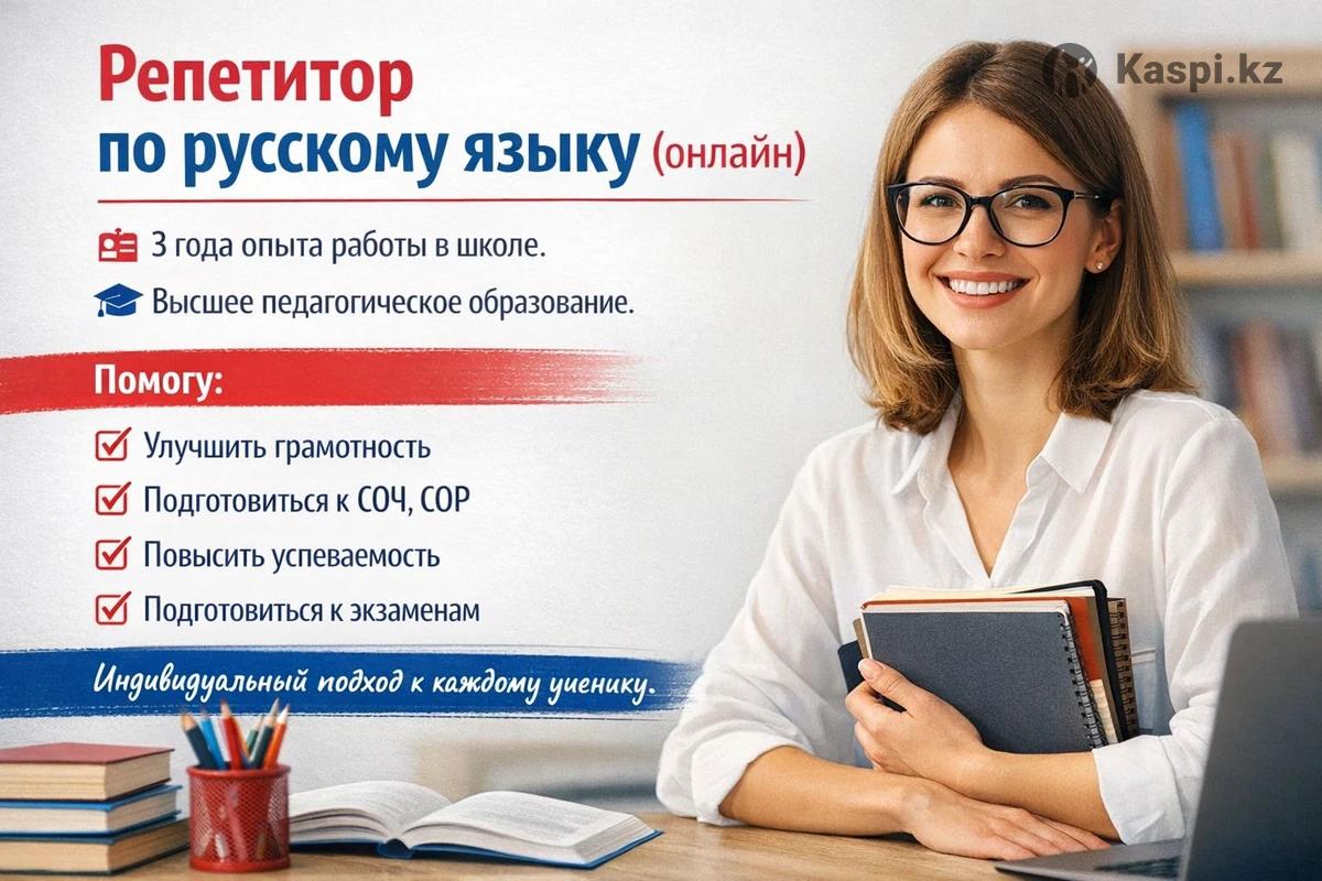 Онлайн-репетитор по русскому языку Имею высшее педагогическое образование и 3 года опыта работы в школе. Работаю с учениками 5–11 классов. Помогаю: •разобраться в сложных темах •повысить уровень грамотности •подготовиться к контрольным работам, СОЧ и СОР •систематизировать знания Занятия проходят в комфортной онлайн-форме. «Свободно владею казахским языком»
