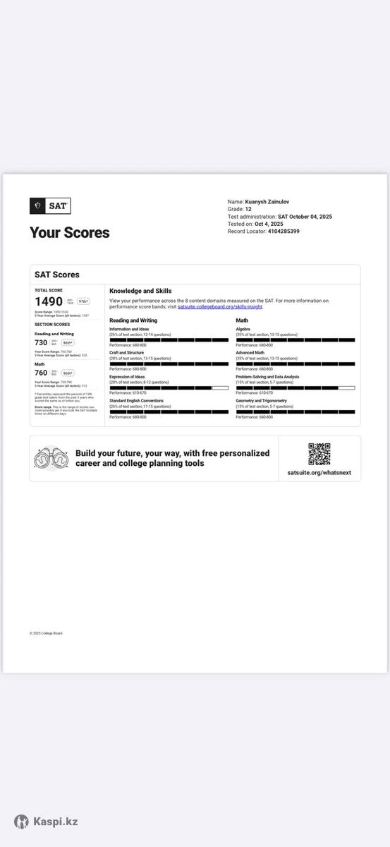 Здравствуйте! Меня зовут Куаныш. Помогаю ученикам уверенно подготовиться к SAT, разбирая формат экзамена и типовые ловушки, а не просто “уча математику и английский”. Немного обо мне: SAT - 1490 (Verbal 730, Math 760) Учусь в 12 классе НИШ Выпускник FLEX 24-25 - год учился в американской школе Английский - уровень С1 Люблю западный юмор и стараюсь делать занятия легкими и понятными Как проходят занятия: Индивидуально, онлайн План подготовки под твою цель и сроки Языки: английский, казахский, русский Стоимость: 5000тг/час. Звоните или пишите в по номеру в объявлении - обсудим вашу задачу!