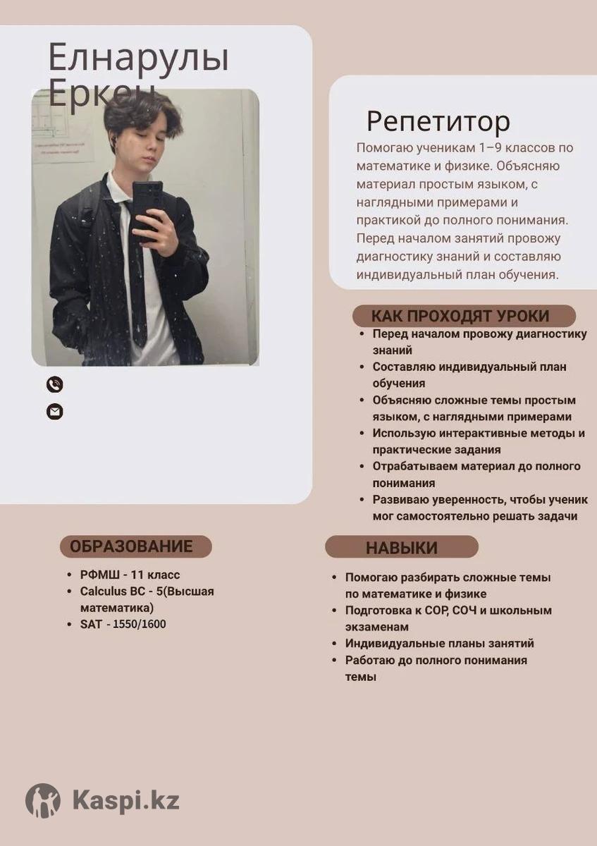 Подготовка к SAT (Math + Verbal): 📘 объяснение SAT Math, Reading и Writing простым и понятным языком 🧠 разбор структуры экзамена и логики заданий ✍️ работа с реальными тестами SAT 🔍 выявление и проработка типичных ошибок 🎯 обучение стратегиям выбора правильного ответа без угадывания ⏱️ тренировка тайминга и экзаменационного мышления 📊 диагностика уровня перед началом занятий 📈 индивидуальный план подготовки под цель ученика 📝 домашние задания с подробным разбором 🚀 при регулярной работе и выполнении ДЗ - результат 1400+ за 3 месяца