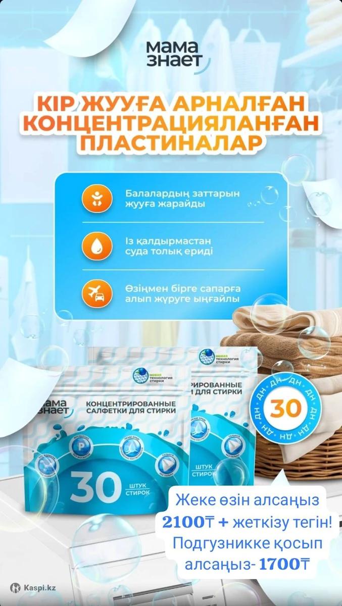 🤩 БІЗ СҰРЫПТАЛЫМ АУҚЫМЫН КЕҢЕЙТЕМІЗ: КІР ЖУУҒА АРНАЛҒАН КОНЦЕНТРАЦИЯЛАНҒАН СУЛЫҚТАР Жеңіл сулық пішініндегі кір жуудің жаңа буыны! ❌ Фосфатсыз, тальксыз, сондай-ақ өлшеуіш стақансыз, кір жуу жеңілдей түседі! ❌ 👕👚🚼 Маталардың барлық түрлеріне жарайды, нәзік талшықтарды зақымдамайды. ❤️🔥 Түрлі-түсті бұйымдарға қанықтық сыйлайды. 😳 Қолайлы әрі үнемді: бір орамда 30 кір жуу. Саңылаусыз орам. 🥶♨ Ыстық суда да, суық суда да тұнбасыз толық ерудің жұмсақ технологиясы - су таза болып қалады! 😍 Сулықтар пайдалануға ыңғайлы: төгілмейді, мөлшерлеуішті қажет етпейді және сақтау үшін ықшам! Клиенттер үшін бағасы: 1800 теңге Сулықтар бүкіл Қазақстан бойынша қолжетімді! Жөргектерге немесе сулықтардың кем дегенде екі орамына тапсырыс берген жағдайда жеткізу тегін МЫ РАСШИРЯЕМ АССОРТИМЕНТ: КОНЦЕНТРИРОВАННЫЕ САЛФЕТКИ ДЛЯ СТИРКИ Новое поколение стирки в форме невесомой салфетки! ❌ Без фосфата, талька, а так же без мерных стаканчиков, что очень облегчает стирку! ❌ 👕👚🚼 Подходит для всех видов тканей, не повреждает деликатные волокна. ❤️🔥 Возвращает насыщенность цветным вещам. 😳 Практично и экономично: 30 стирок в одной упаковке. Герметичная упаковка. 🥶♨ Мягкая технология полного растворения как в горячей, так и в холодной воде без осадка - вода остается чистой! 😍 Салфетки удобны в использовании: не рассыпаются, не требуют дозаторов и компактны для хранения! Цена для клиентов: 1 800 тенге Салфетки уже доступны по всему Казахстану! Доставка бесплатная при заказе подгузников или от двух упаковок салфеток 🫶🏻