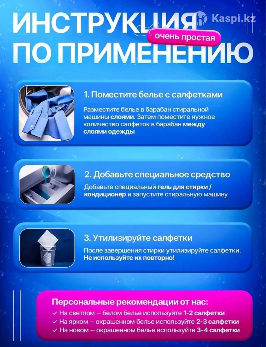 Доставка по рк Салфетки против окрашивания для стирки - надежная защита ваших любимых вещей! Каждая хозяйка знает, как неприятно, когда после стирки цвета одежды неожиданно смешиваются, либо появляются некрасивые пятна. Но мы знаем, как предотвратить подобные неприятности и сделать ваш процесс более безопасным и эффективным! Представляем вам одноразовые салфетки от окрашивания, которые стали незаменимыми помощниками в заботе о вашем белье. Салфетки ловушки цвета - это уникальная разработка, которая надежно блокирует и впитывает пигмент. Они специально разработаны для всех видов тканей: для цветных, белых, чёрных. Благодаря своей универсальности, вы можете быть уверены, что ваша одежда останется яркой, насыщенной и не потеряет своего первоначального вида. Очищающие салфетки для белья предотвращают попадание красителя на другие вещи и делают процесс стирки максимально безопасным. Теперь вы можете стирать разные цвета одновременно - они никогда не покрасят друг друга и останутся чистыми! А также могут использовать против шерсти в стиральном барабане. Блокиратор цвета вещей - это настоящий спаситель не только для вашей одежды, но и для обуви. Он эффективно очищает подошву и удаляет пятна, оставляя безупречно чистой и свежей. Больше не нужно тратить время на предварительную обработку пятен - они справятся с этой задачей за вас! Купив магнит красителя во время стирки, вы не только получаете гарантию качества и эффективности, но и заботитесь о сохранении красоты и долголетии ваших вещей.