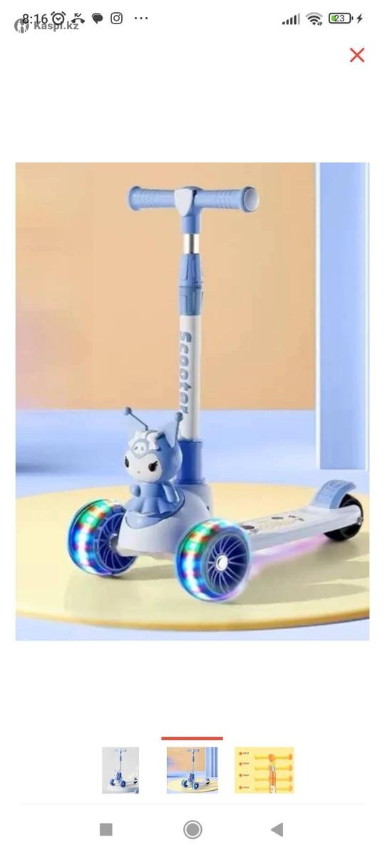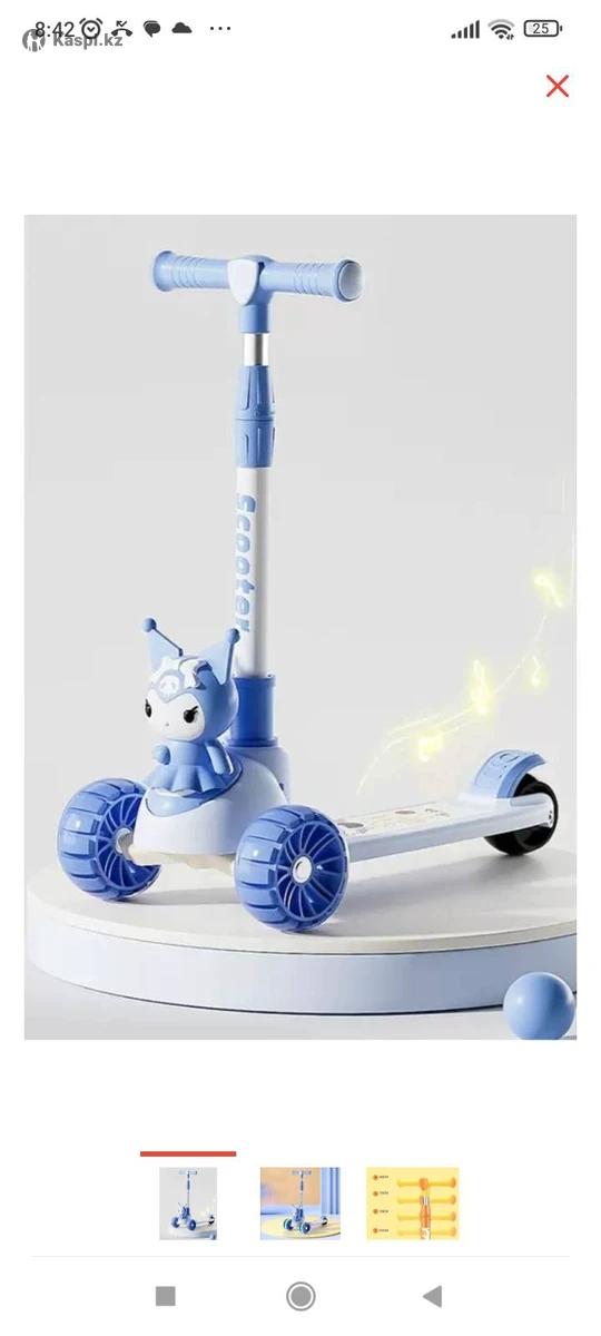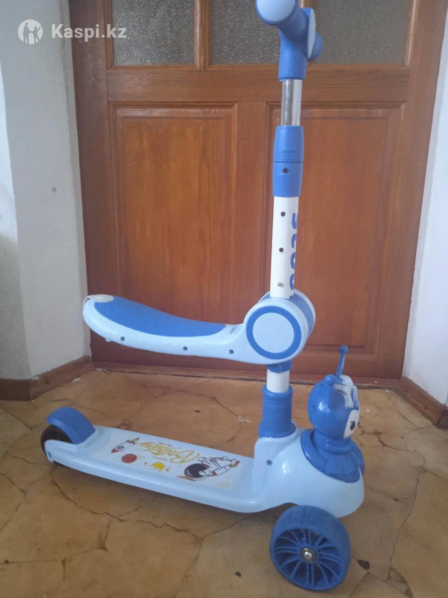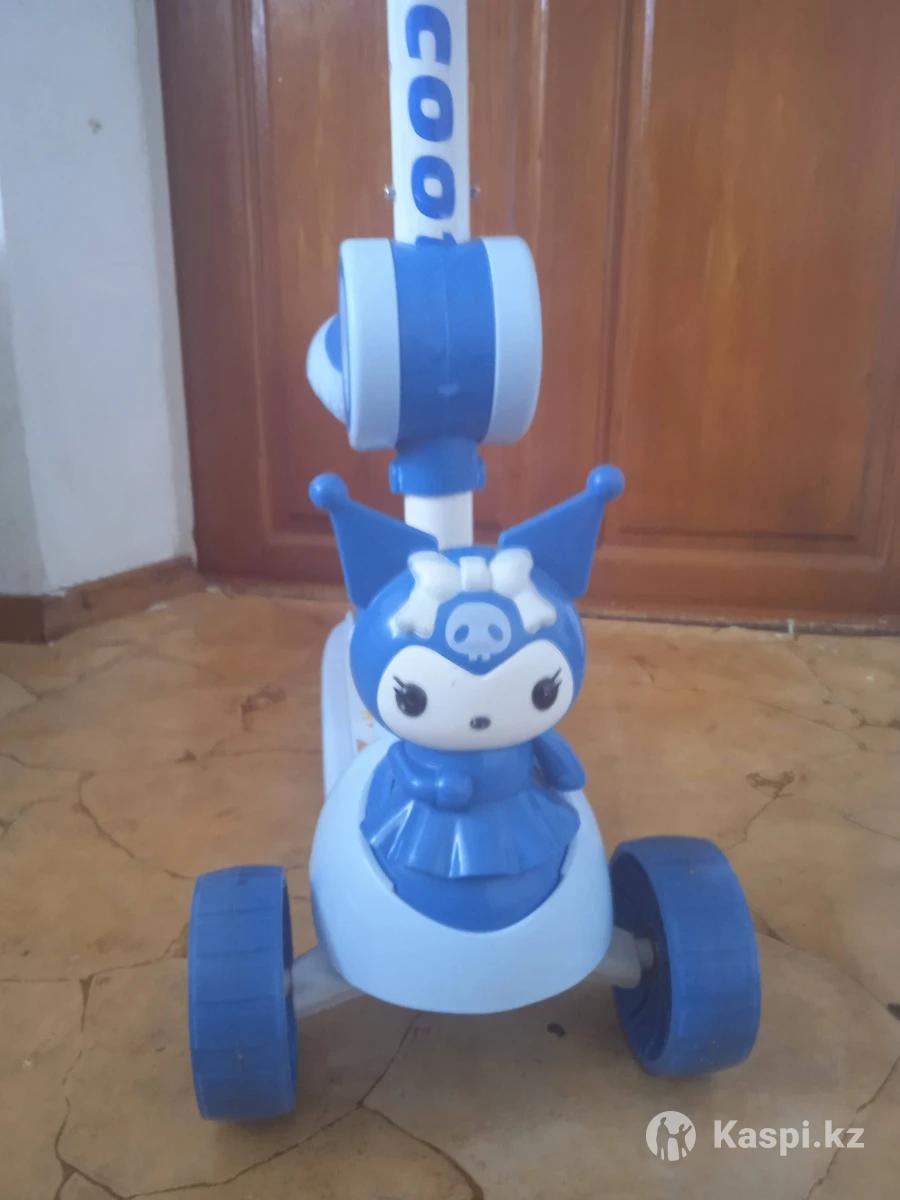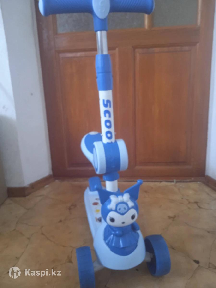 Самокат куроми с сиденьем синий новый. Музыкальный на батарейках, со светящимися колесами, можно кататься стоя и сидя. Возраст с 2-8 лет. Цена 9.900т.