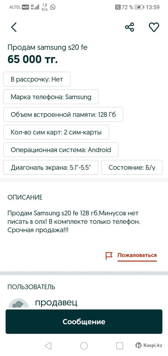 Продам Samsung S 20 fe память 128гб состояние отличное без трещин и скол в комплекте только сам телефон. Цена 65000 тенге, обмена нет, срочная продажа!!!! Писать сюда желательно.