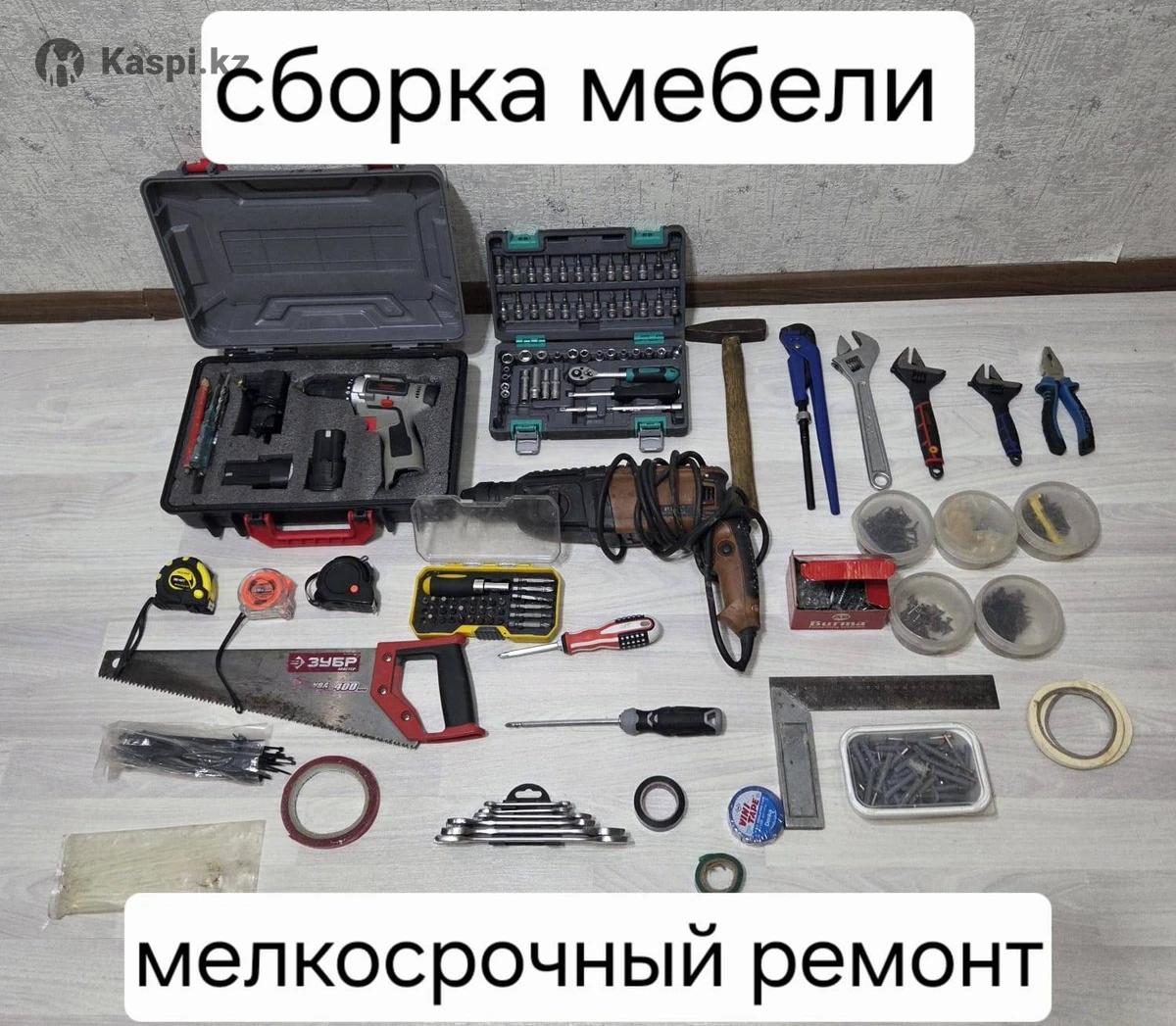 Сборка мебели. Муж на час. Мастер на все руки Частный мастер Данияр. Выезд сегодня! Что делаю: • Сборка мебели: шкафы, кухни, кровати, комоды. Разборка. • Навеска: ТВ-кронштейны, гардины, полки, люстры. Сверлю чисто! • Сантехника/Электрика: смесители, течи, розетки. Почему я: • Выезд 0 тг (при заказе). • Гарантия 14 дней на работу. • Весь инструмент свой (фото реальные). • Чистота после ремонта. Цены от 5000 тг. Пишите на — оценю по фото!