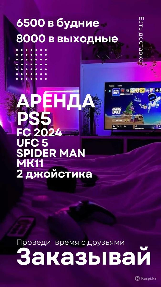 Аренда PlayStation 5 • Будни — 6500₸/сутки • Выходные — 8000₸/сутки Акция: 2 дня + 1 в подарок В комплекте: • FC 2024 • UFC 5 • Mortal Kombat 11 • Spider-Man • 2 джойстика Все оборудование новое: • PS5 и джойстики — в отличном состоянии, ничего не лагает, все работает четко и без сбоев Дополнительно: • Бесплатная доставка и установка • Удостоверение обязательно • Для съемных квартир — 2 залога • На приставке и джойстиках установлены GPS-трекеры Пиши, чтобы забронировать! Количество дней ограничено.