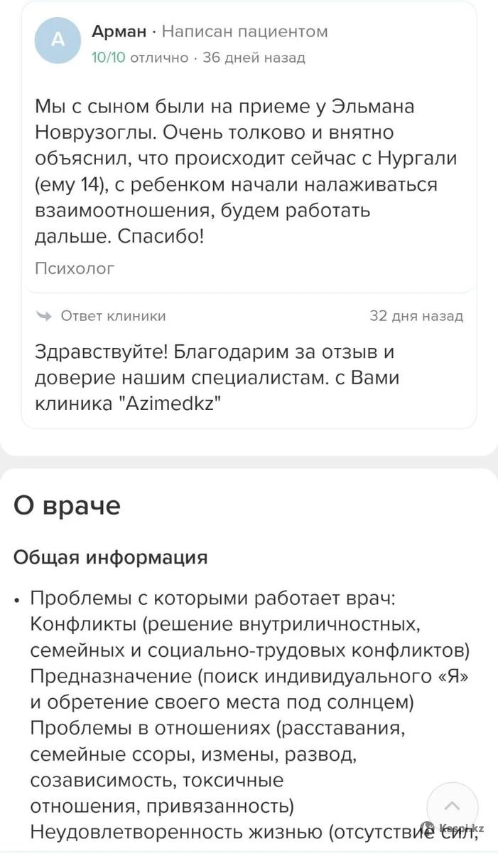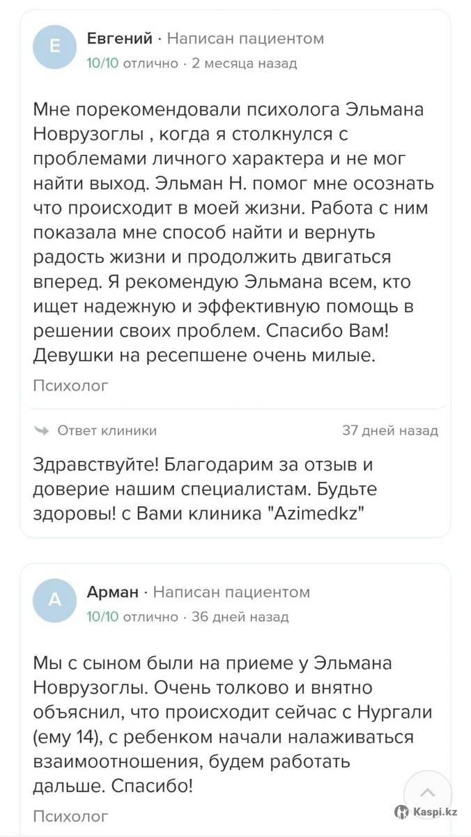 Провожу приемы, терапии в качестве семейного психолога, сексолога для семейных пар, решения кризисных моментов в отношениях, подростков в момент пубертатного переходного возраста, психотерапии для познания и проработки внутренних переживаний, панических атак, раскрытия и принятия себя, для записи на прием просьба обращаться в клинику Azimedkz или через Doqkz. Так же есть онлайн консультация.
