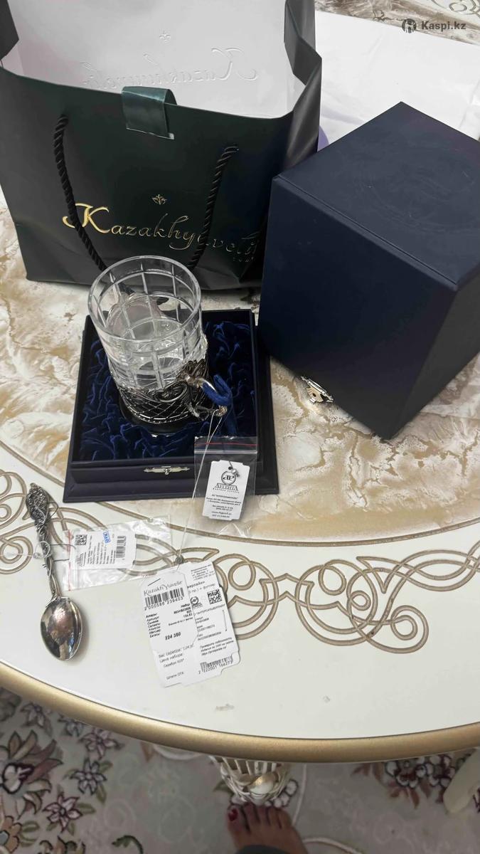 Абсолютно новый набор серебряная ложка+ подстаканник из серебра 925 пробы магазин Казахювелир завод изготовитель Аргента . Шикарный набор для ценителей посуды . В коробке в подарочной упаковке с пломбой Стоило 224 тыс . Торг реальному покупателю