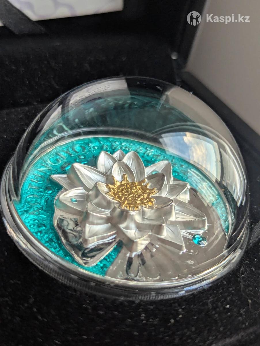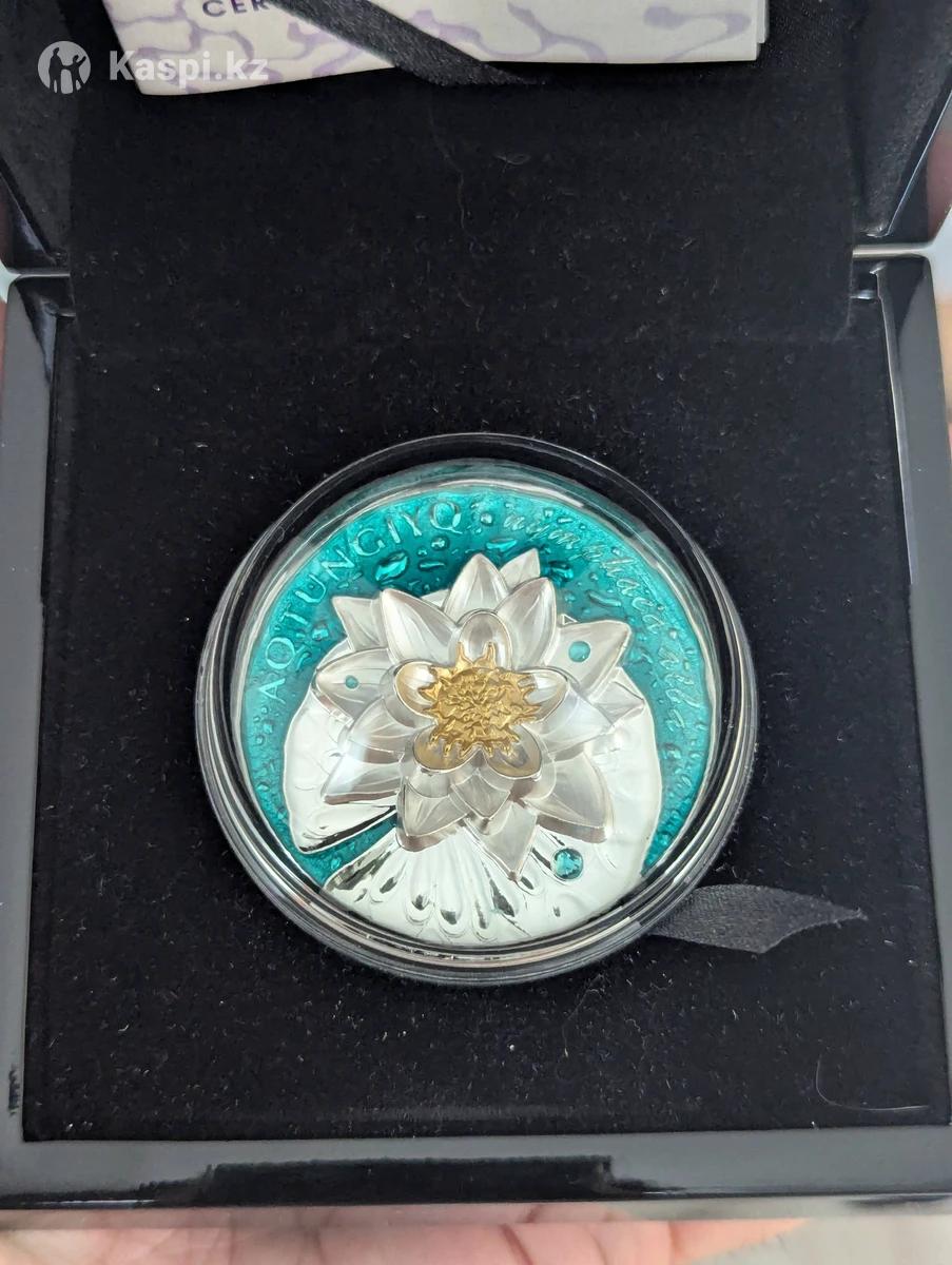 AQ TUŃǴIYQ (Кувшинка белая) — редкий для Казахстана цветок, занесенный в Красную книгу. Впервые применена новая технология, при которой монета заполняется прозрачной эмалью, создающей эффект водной поверхности с песчаным дном и камнями. Монета изготовлена: — из серебра 925 пробы с применением технологии 3D, массой 100 грамм, диаметром 50 мм, качеством изготовления proof, номиналом 1000 тенге. Тираж 500 штук.