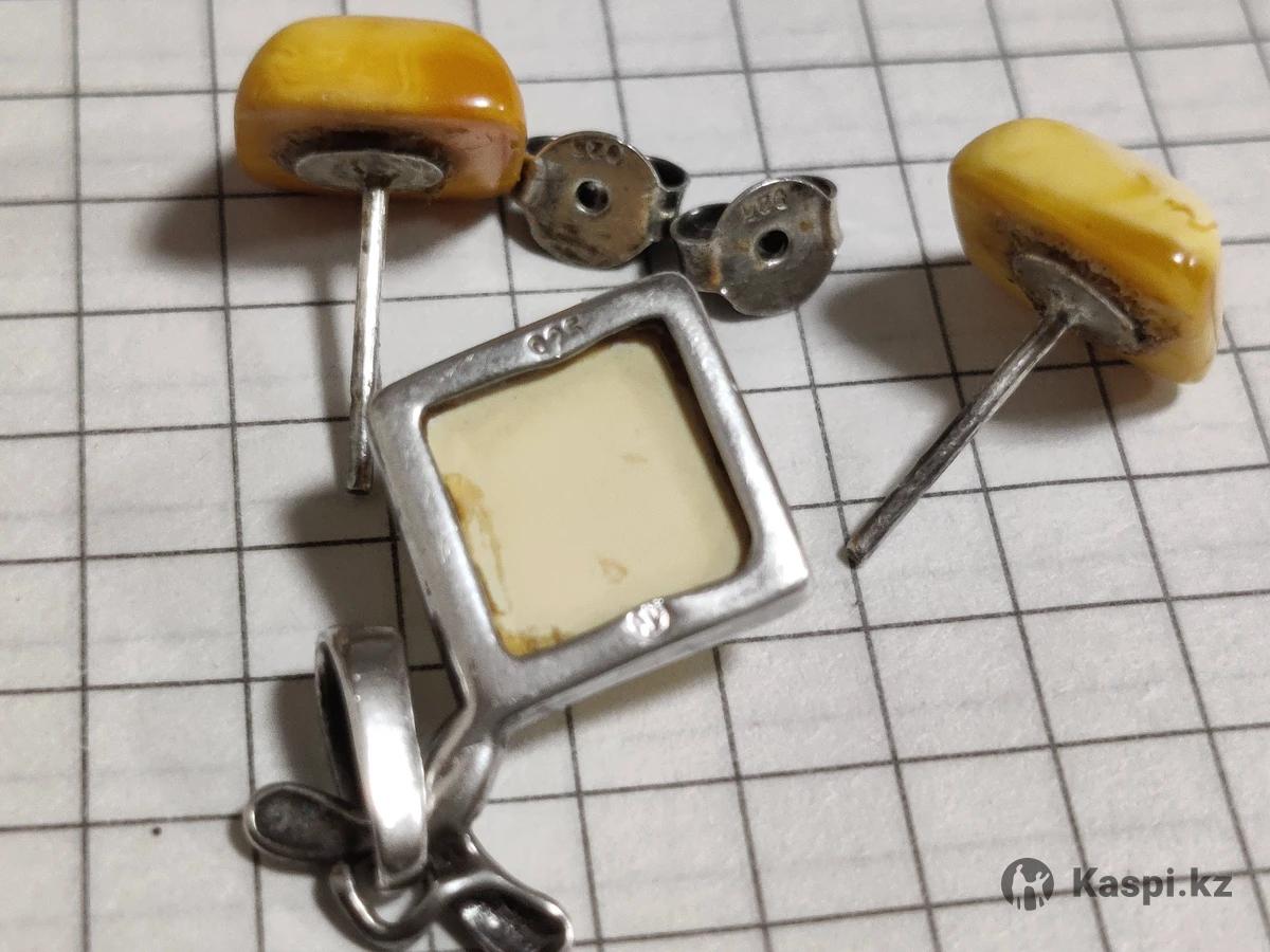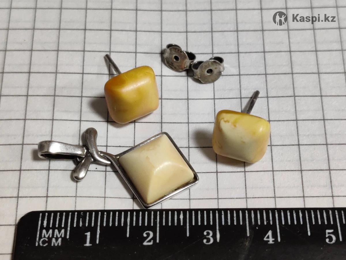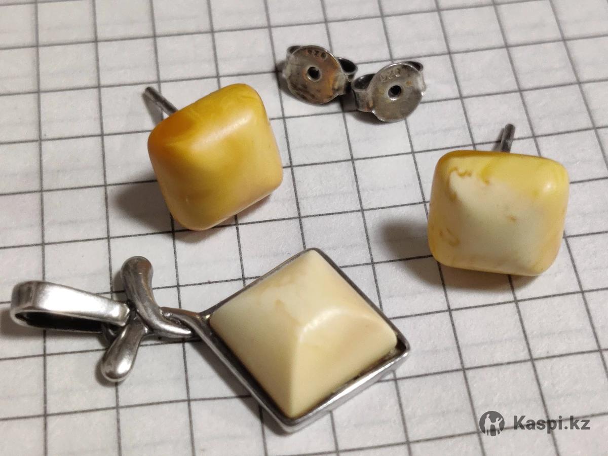 Серьги-гвоздики и кулон. Серебро. Белый янтарь.