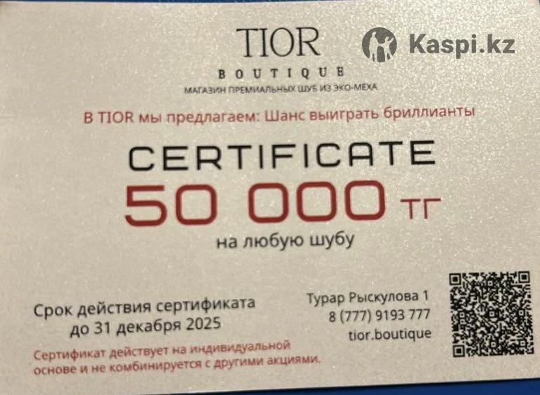 Сертификат на 50.000 тг. На покупку шубы , Tior boutique.