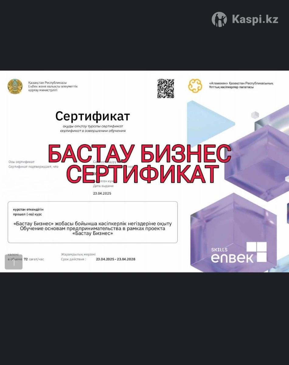 Помогу с получением Сертификата Бизнес Бастау для получения 400 МРП Грант от государства на развитие бизнеса, действие сертификата 3 года + помощь в выборе бизнес плана.